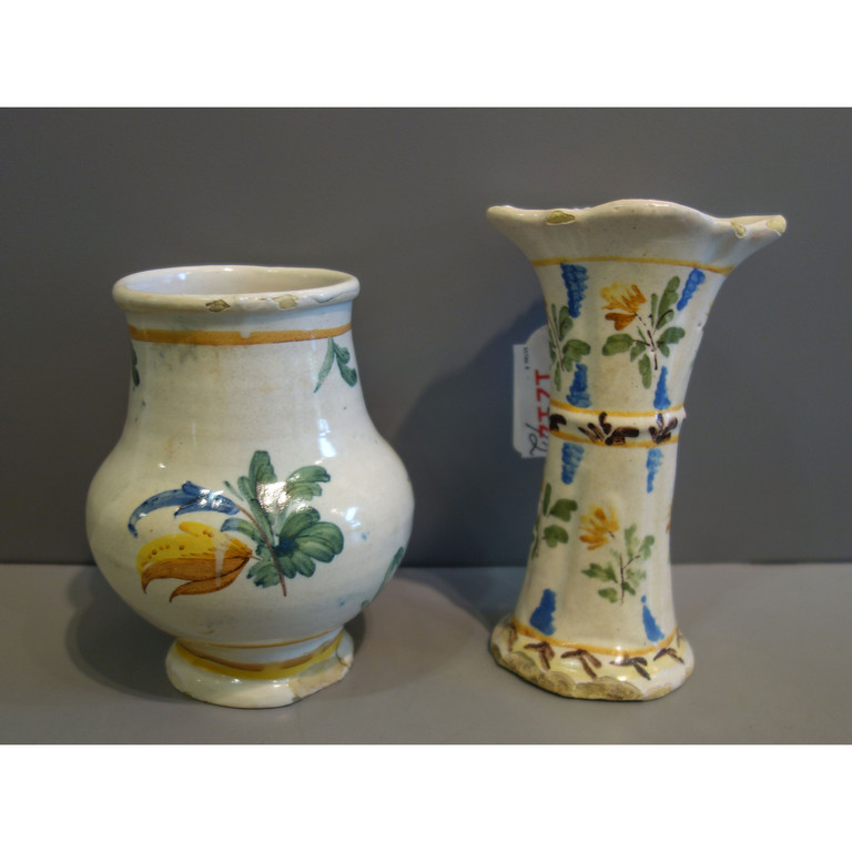 Due vasetti in ceramica di Savona decorati a fior di patata su fondo bianco sec.XVIII