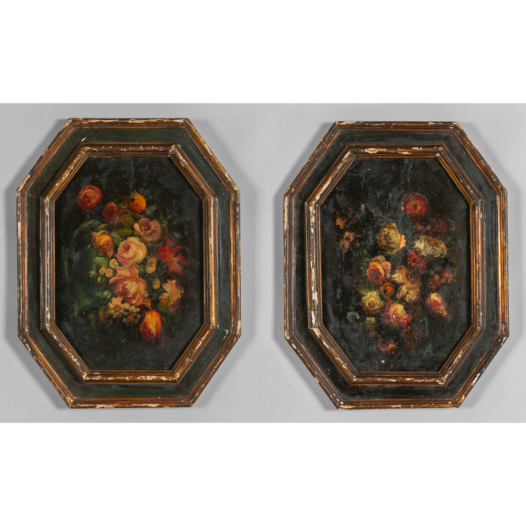 'Fiori' coppia di olii su tavoletta di forma ottagonale