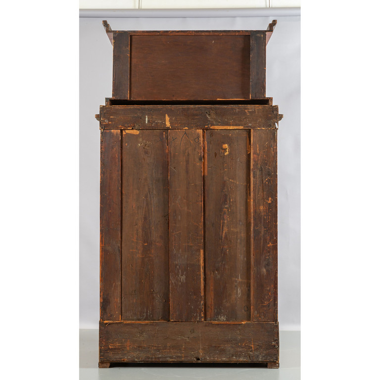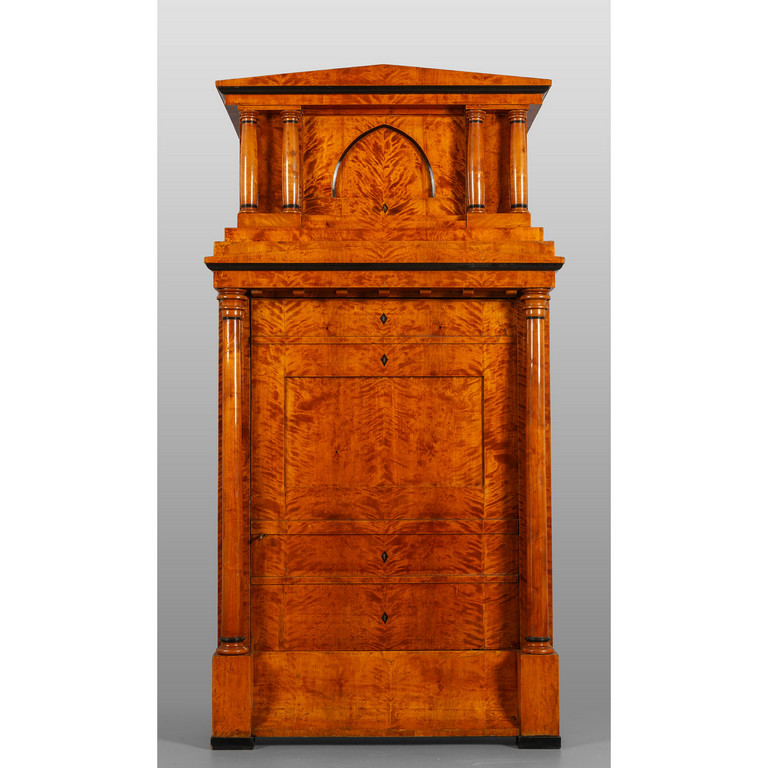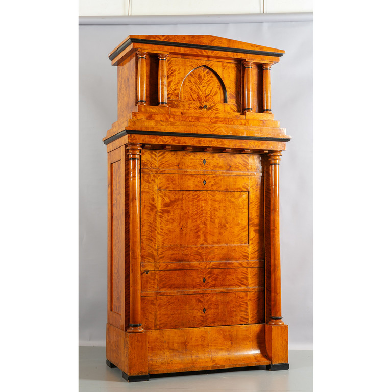 Grande secretaire-libreria Biedermeier impiallacciato in radica di acero con parte superiore a tempietto sec.XIX
