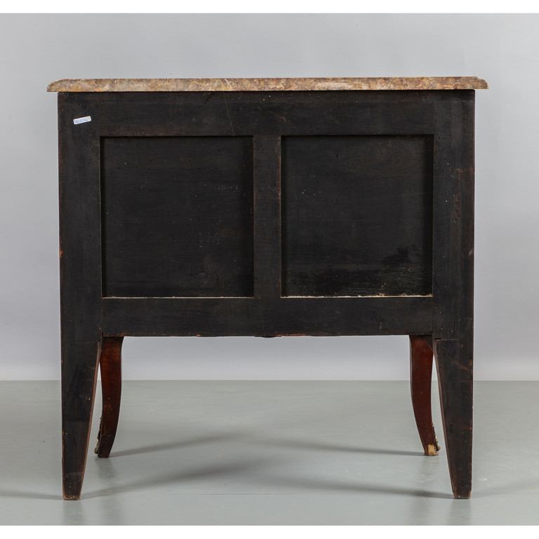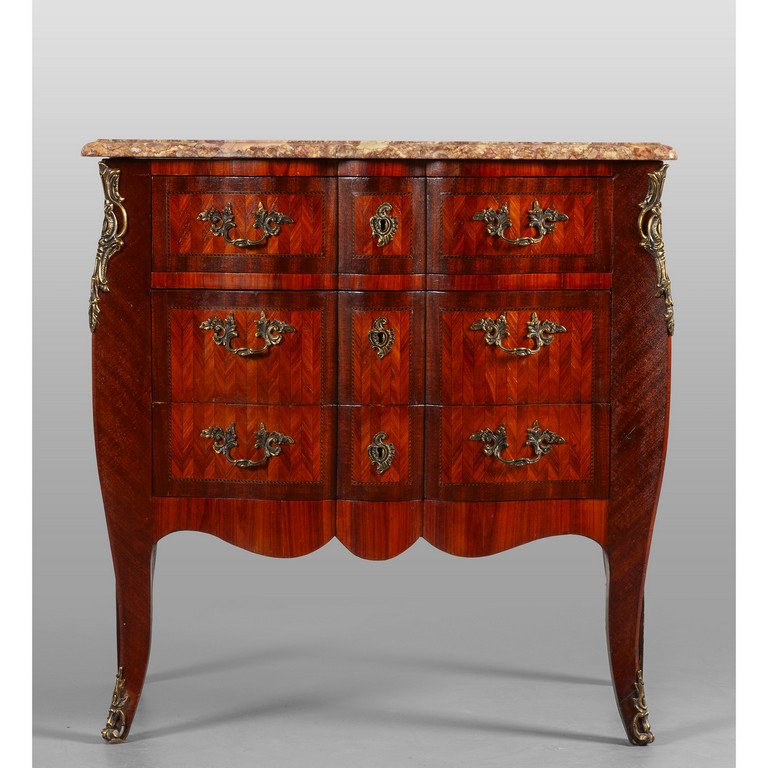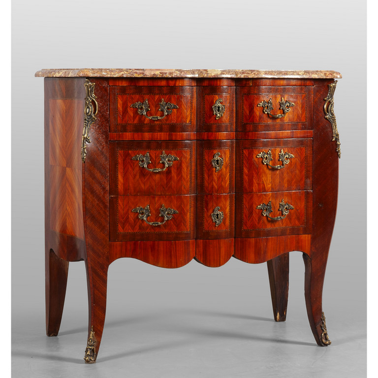 Piccolo comò a tre cassetti in stile Luigi XIV mosso sul fronte e sui fianchi piano in marmo Francia fine sec.XIX