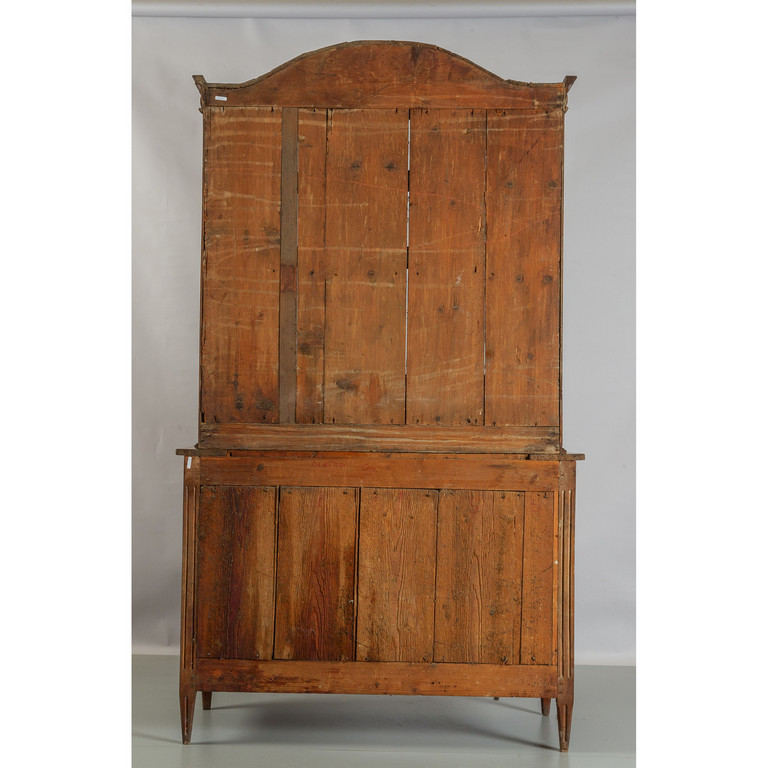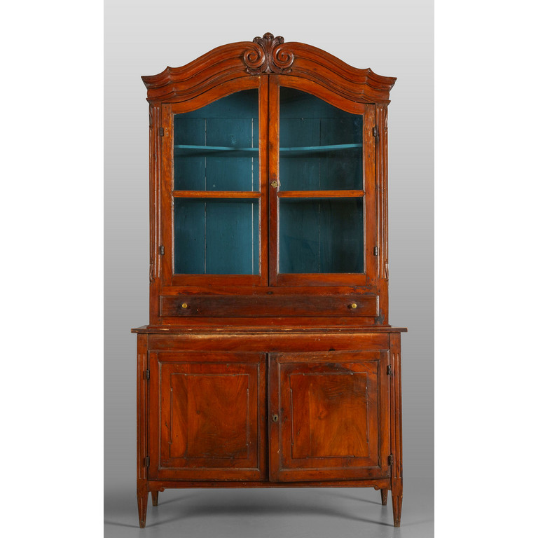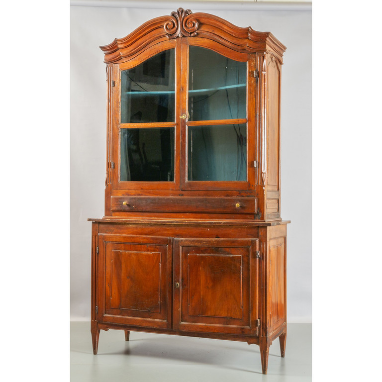 Credenza con alzata in noce parte inferiore a due sportelli parte superiore a vetrina con un cassetto fine sec.XVIII