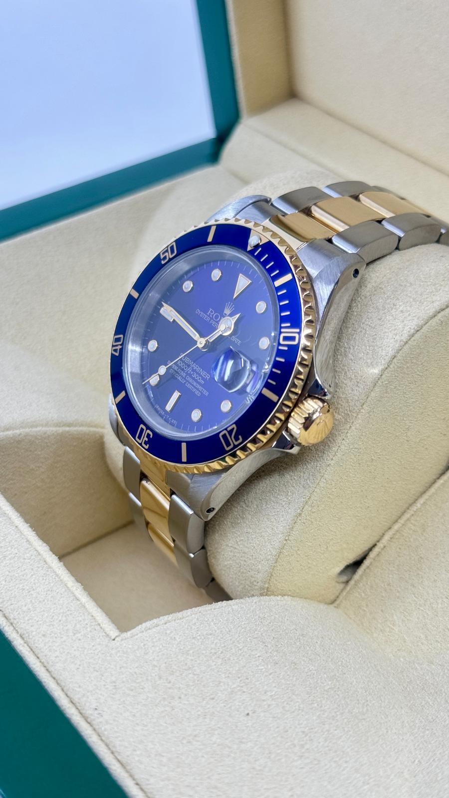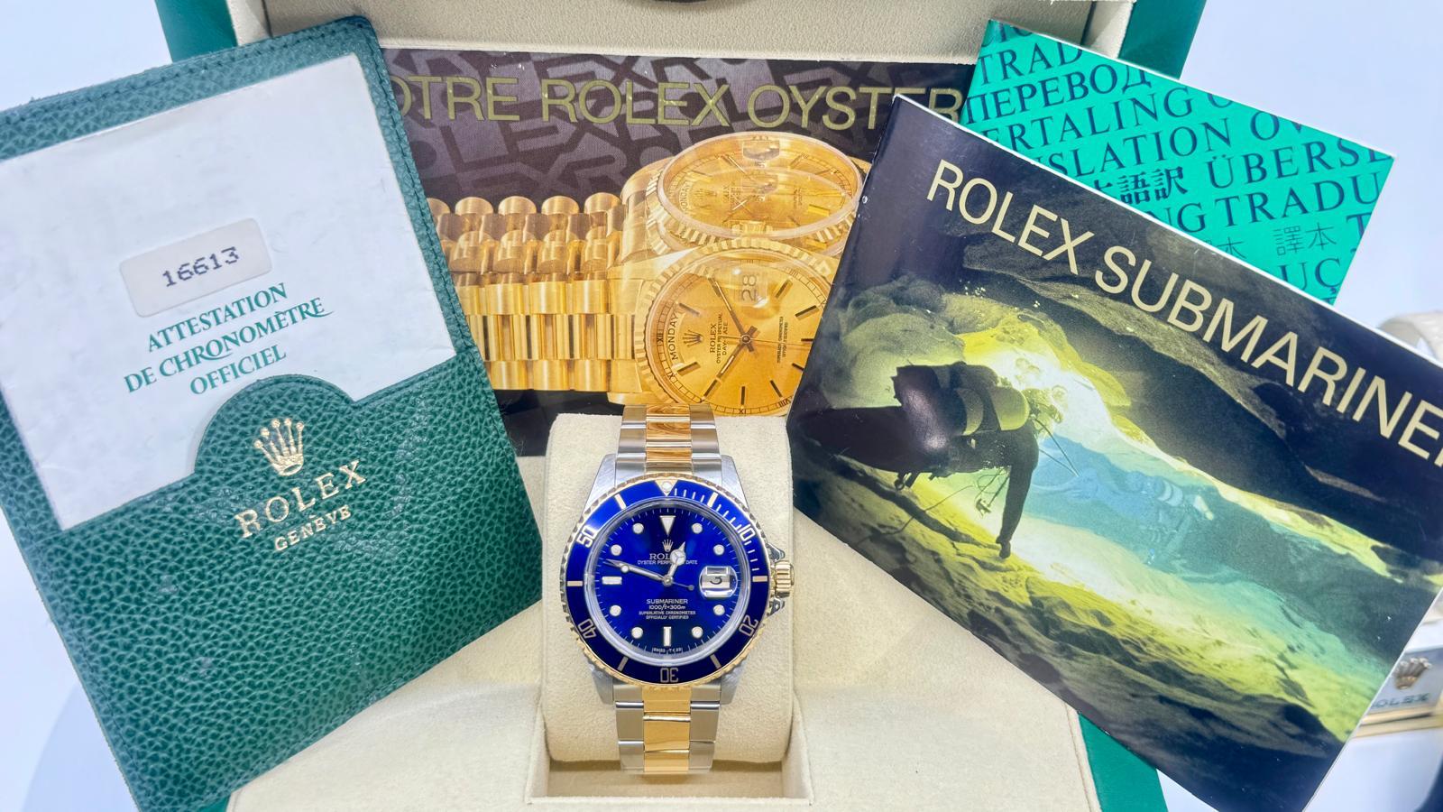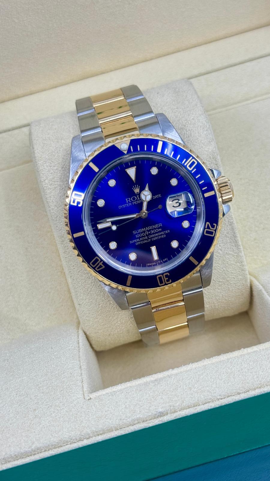 Marca Rolex Modello (Orologio) Submariner Date Numero di referenza 16613 Carica Automatico Materiale della cassa Oro/Acciaio Materiale cinturino Oro/acciaio Anno di produzione 1988 Condizione Ottimo (di seconda mano, segni di usura assenti o appena visibili) Corredo documenti originali Rolex, no box Cassa Materiale della cassa Oro/Acciaio Diametro 40 mm Impermeabile 30 ATM Materiale lunetta Oro giallo Vetro Vetro zaffiro Quadrante Blu Numeri sul quadrante Senza numeri Cinturino Materiale cinturino Oro/acciaio Colore cinturino Oro/acciaio Chiusura Déployante