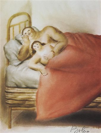 BOTERO FERNANDO (n. 1932) Senza titolo. . Fotolitografia. Cm 21,00 x 28,00. Esemplare 2031. Riproduzione fotolitografica dell' opera originale "Lussuria" eseguita per la serie "I sette peccati capitali" di Bolaffi arte. Firma originale in basso a matita.Ed, BolaffiArte. Anni '70. Timbro a secco BolaffiArte in basso a sinistra. Tiratura al retro.