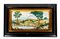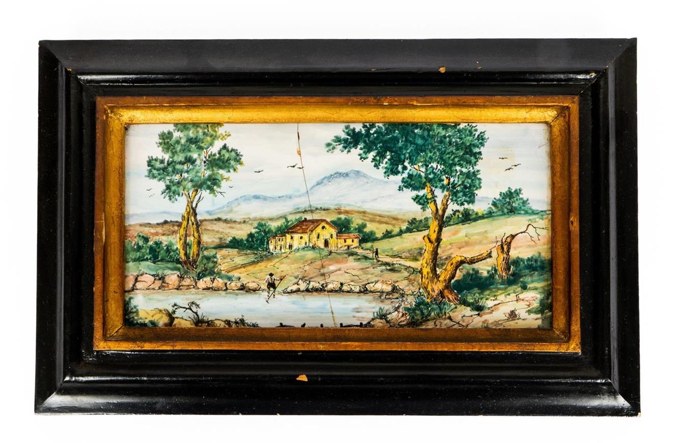 Mattonella maiolicata rettangolare con paesaggio, caseggiati e viandante che cerca di guadare un fiume. Manifattura del centro Italia della metà del XX secolo