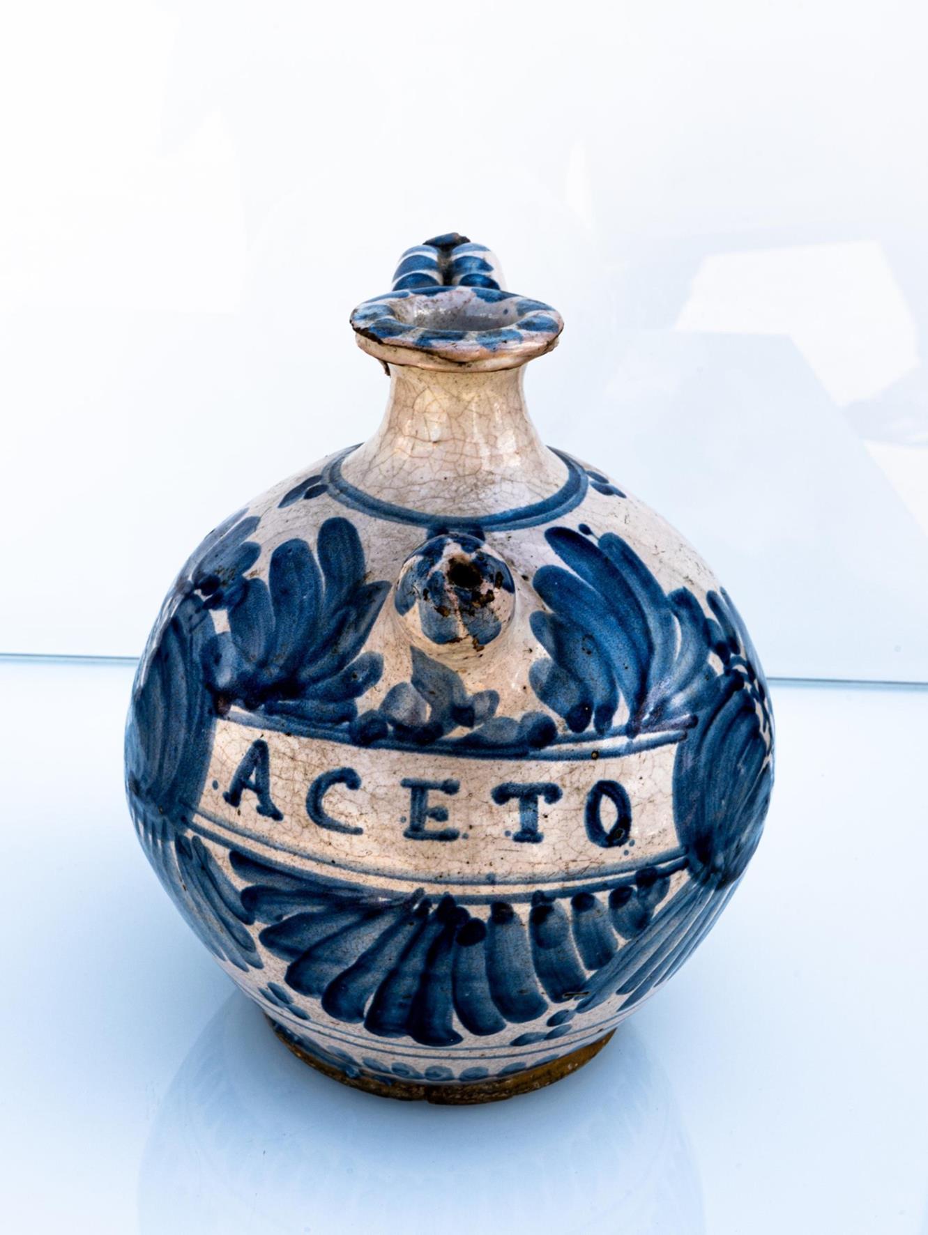 Orciolo monoansato del XVIII secolo blu con al fronte in lettere capitali scritta ACETO