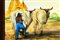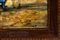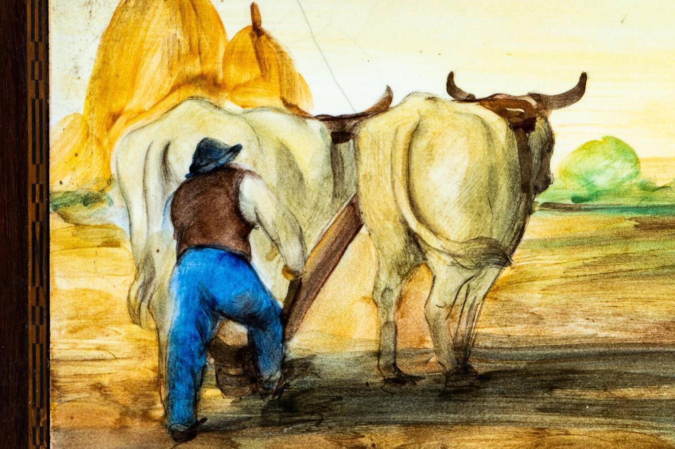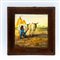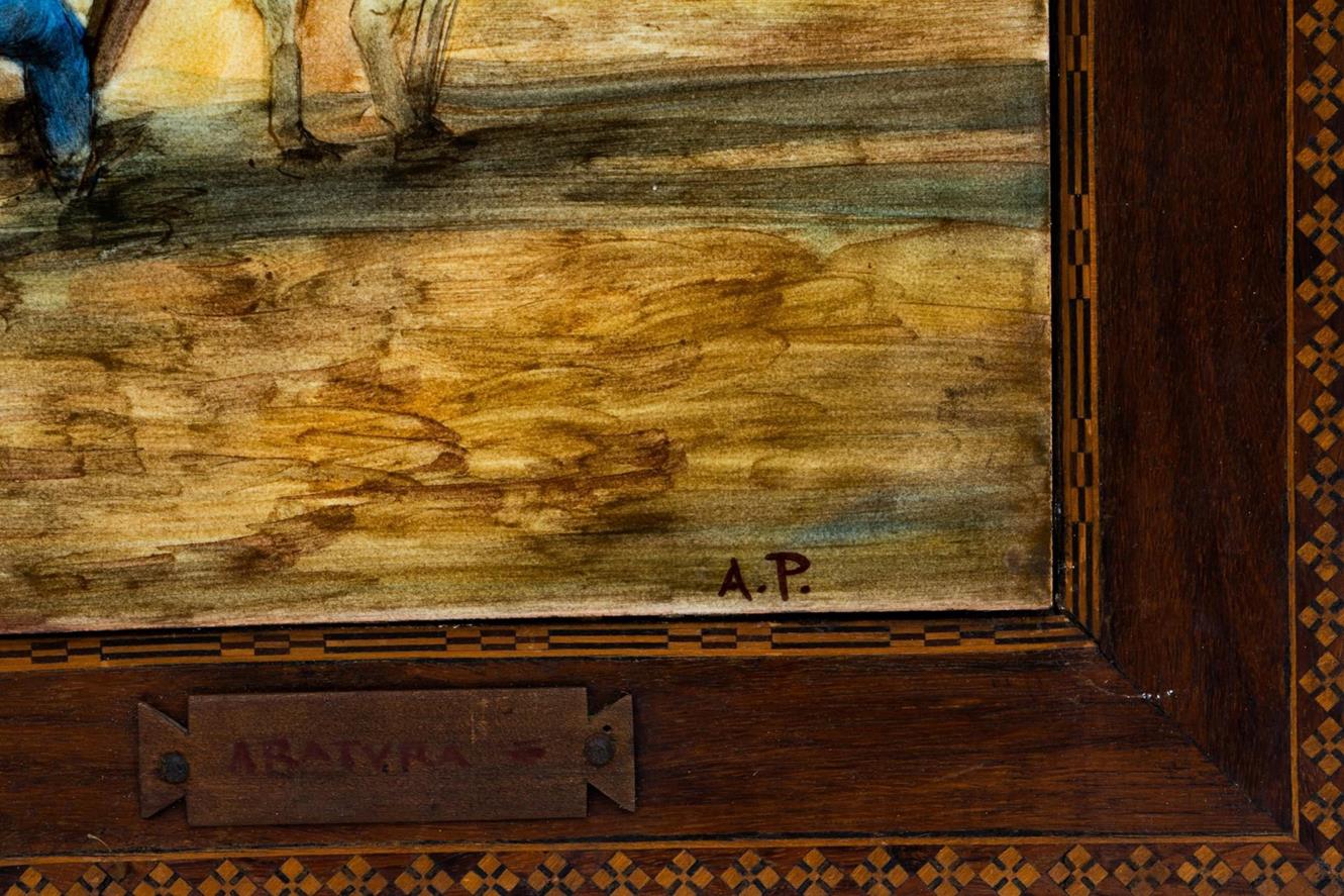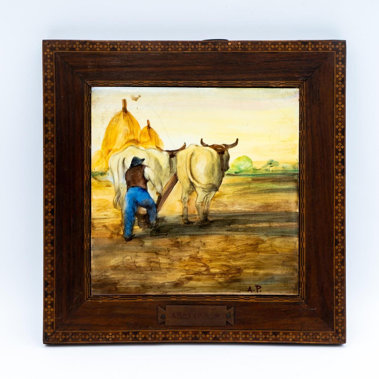 Mattonella maiolicata raffigurante aratura con buoi. Siglata "A.P." in basso a destra. In cornice