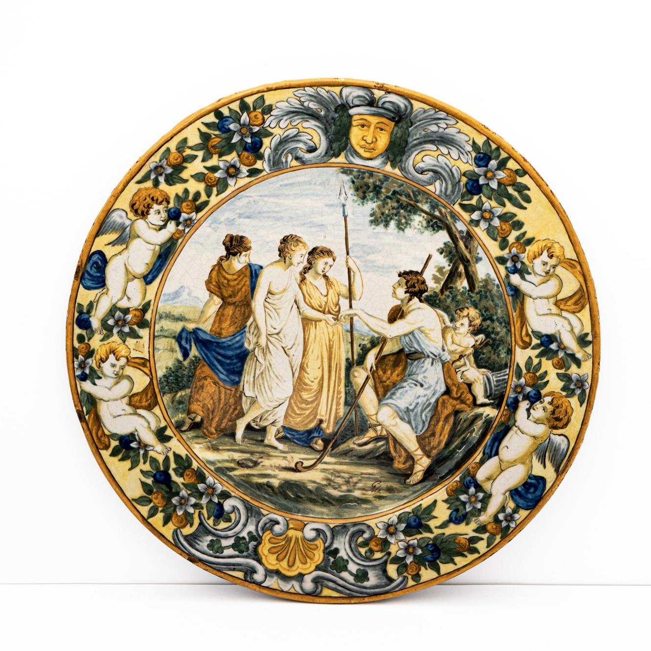 Grande piatto istoriato con tesa decorata con putti, serti fioriti, mascherone e cartigli. Al cavo con scena dal Giudizio di Paride