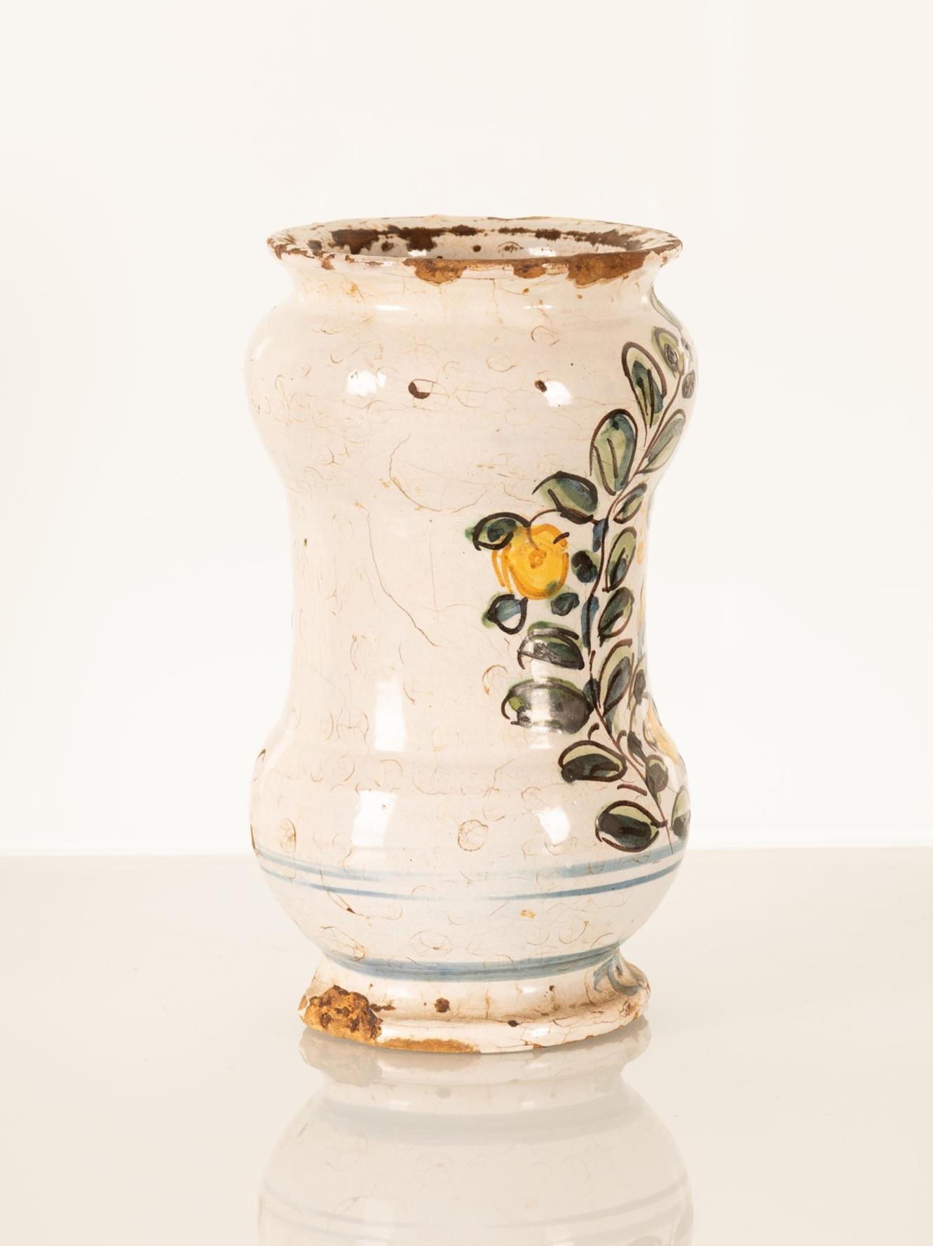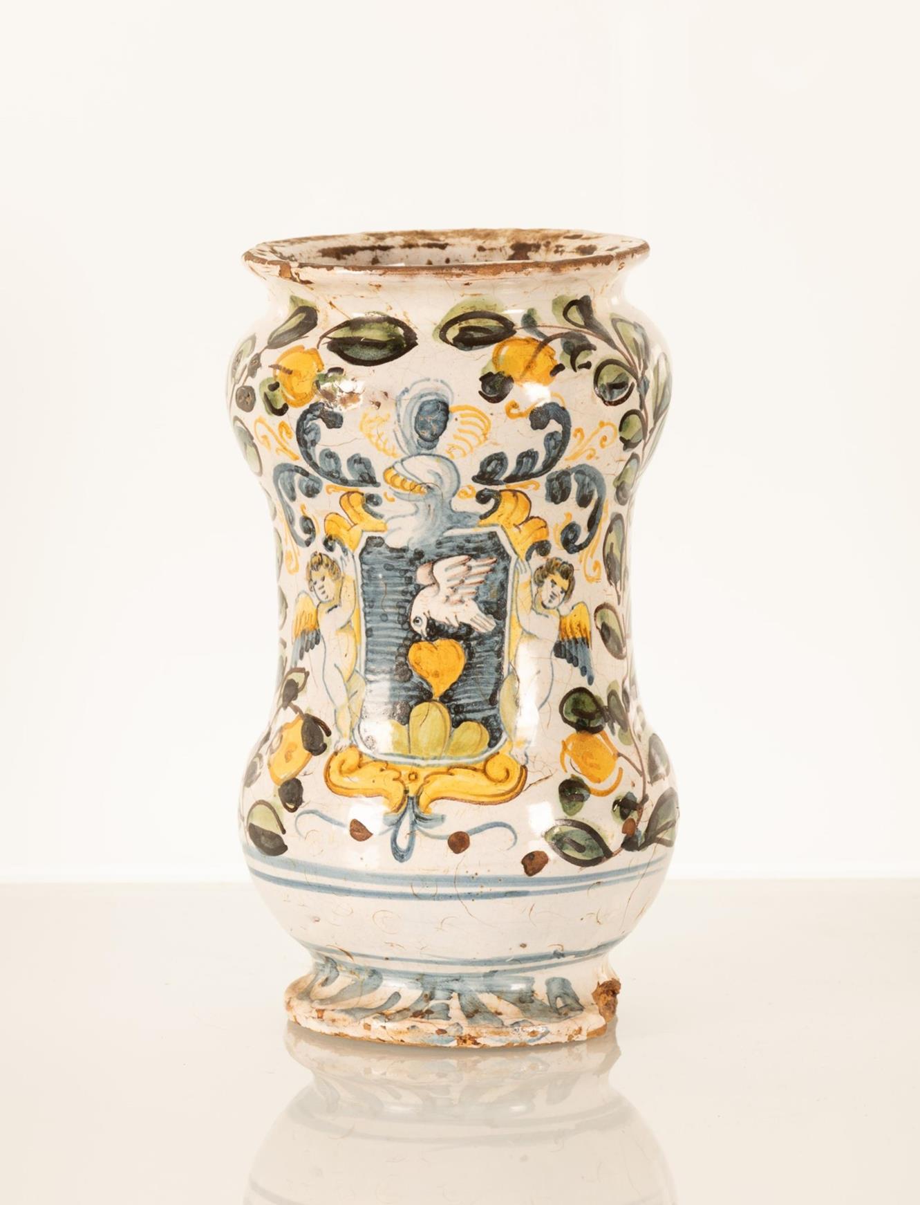 Albarello da farmacia decorato con due serti fioriti stante ad incorniciare un blasone sorretto da due angeli con al centro un'aquila che becca un cuore dorato in cima a tre monti. Manifattura di Torre dei Passeri, fine XVII secolo - primi decenni del XVIII secolo.