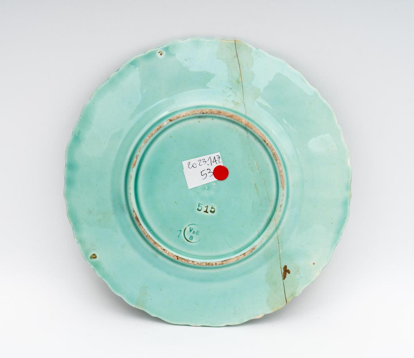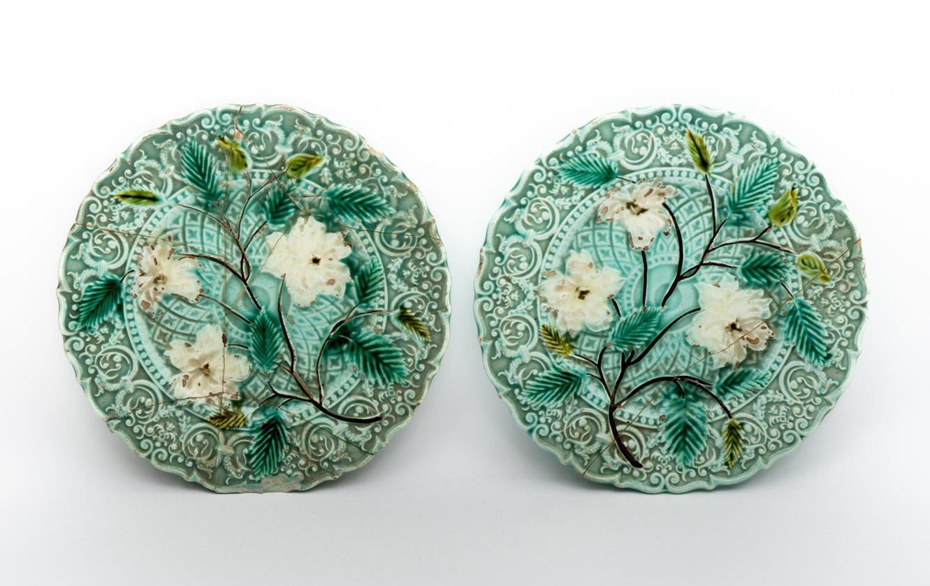 Coppia piattini verde acqua con decoro fiorato a "barbotine"