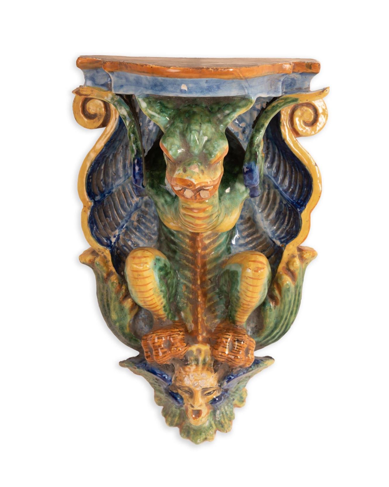 Coppia di mensole in ceramica policroma con draghi e mascheroni
