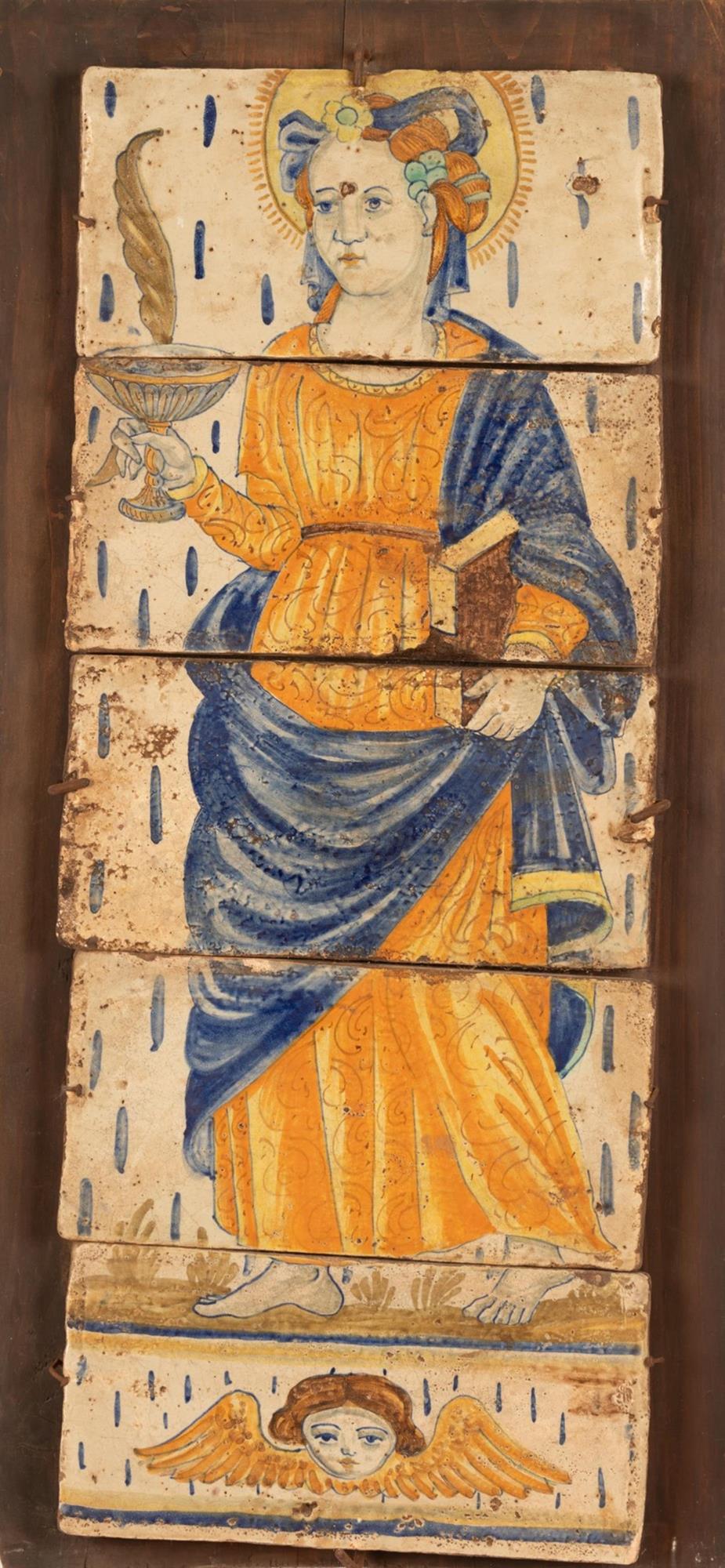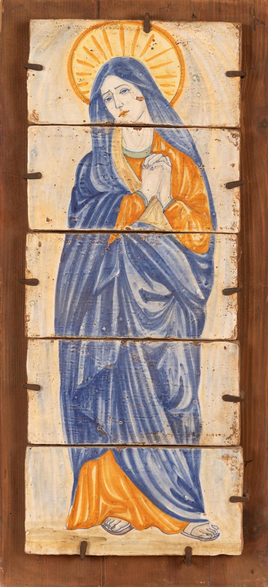 Lotto di tre composizioni con mattoni maiolicati raffiguranti figure devozionali. Manifattura di Castelli, dell'ultimo quarto del XX secolo