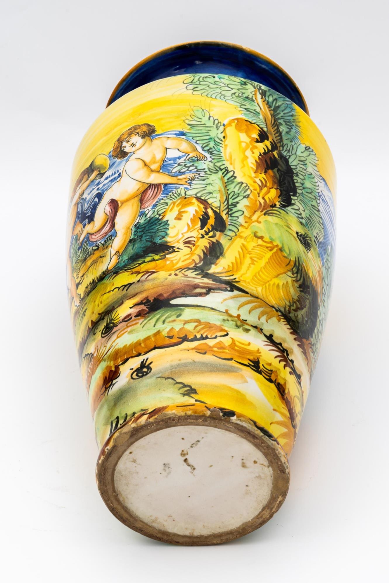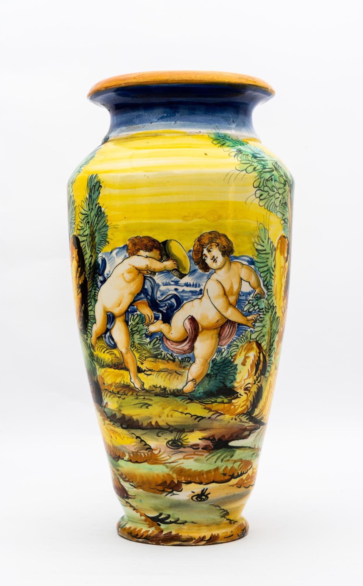 Vaso interamente istoriato con putti danzanti sul fronte e paesaggio al retro Manifattura del Centro Italia del XX secolo