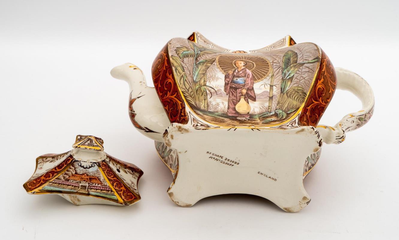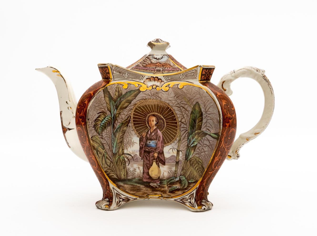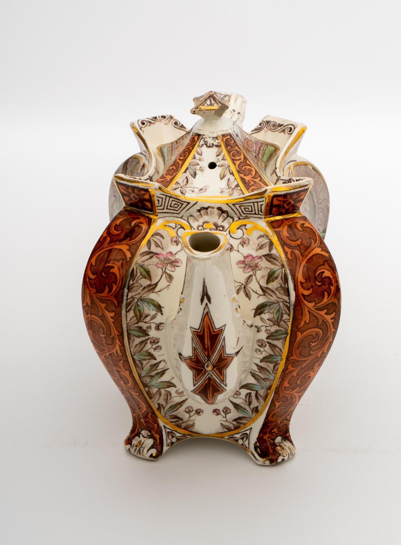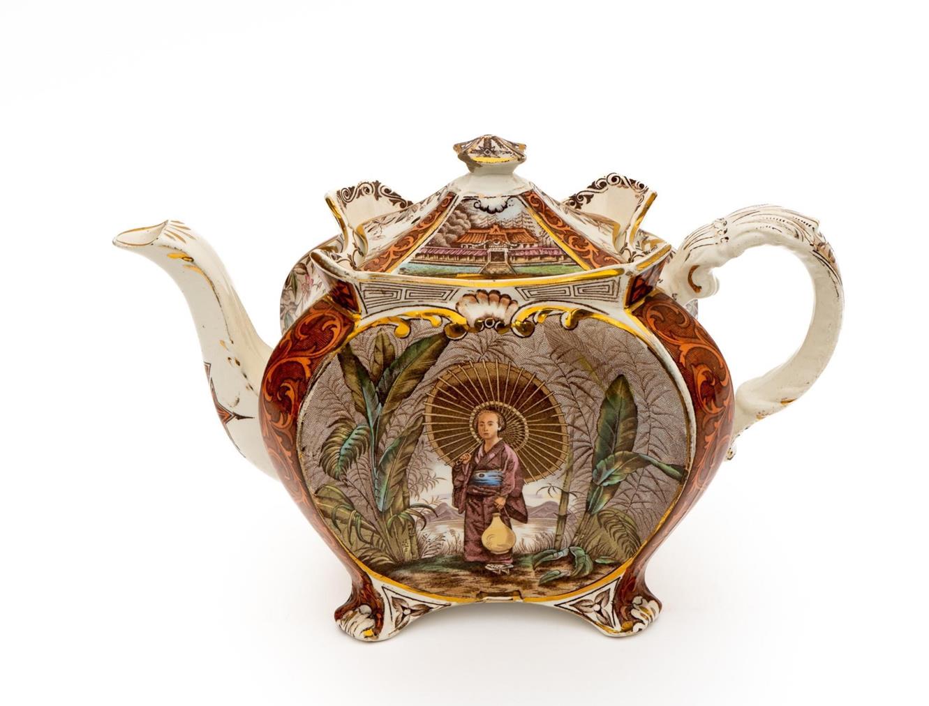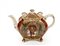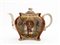 Teiera a bordi mistilinei in policromia e lumeggiata in oro poggiante su quattro piedi, manico a nastro riccamente decorato a rilievo e dipinto a serti fioriti Manifattura inglese del XX secolo