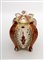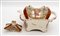 Teiera a bordi mistilinei in policromia e lumeggiata in oro poggiante su quattro piedi, manico a nastro riccamente decorato a rilievo e dipinto a serti fioriti