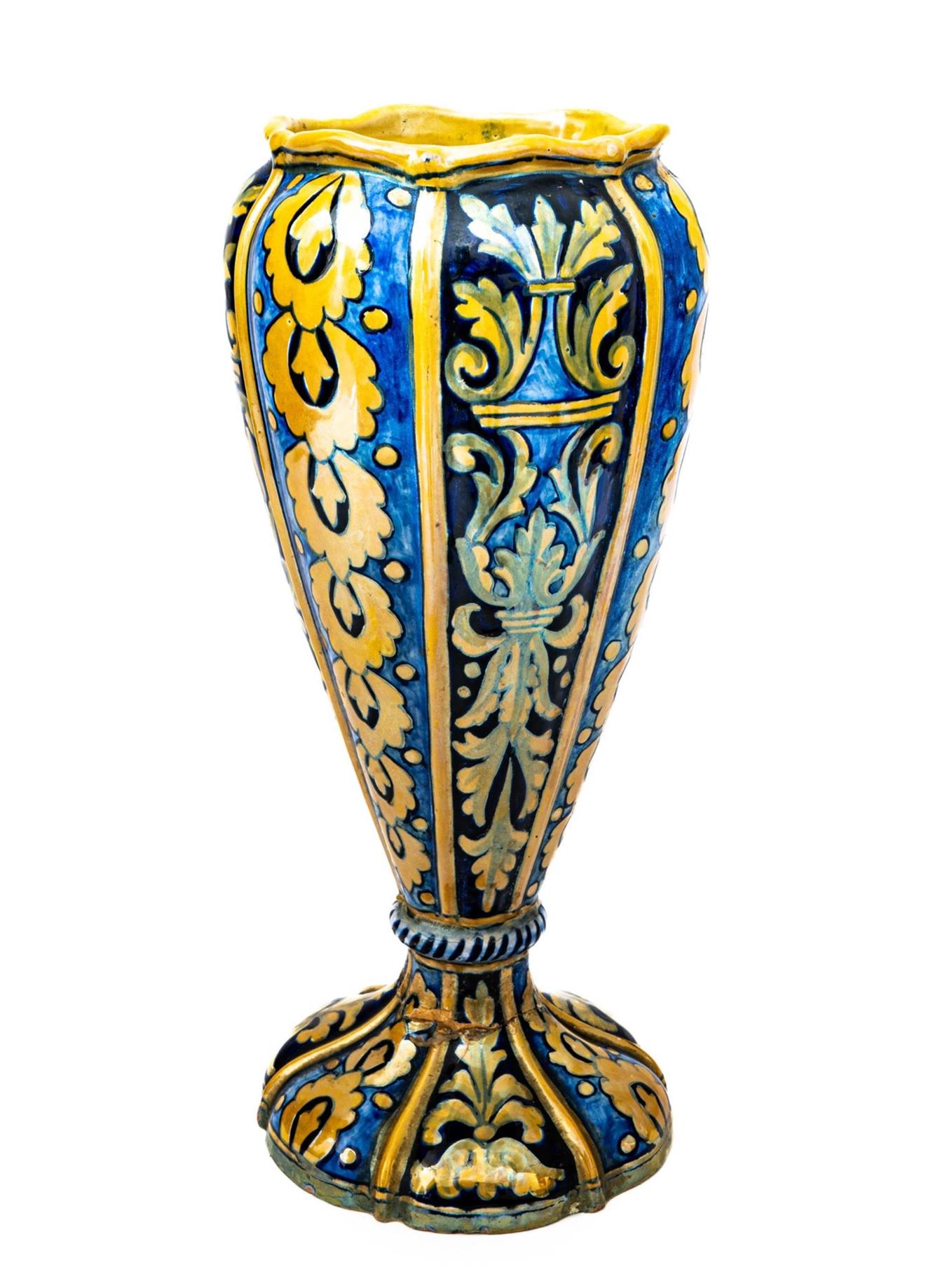 Lot 124 | Vaso-calice costolato a bordo mistilineo decorato a lustro metalico con alternanza verticale di motivi fitomorfi e fantastici. Manifattura di Gualdo Tadino degli anni '40 del Novecento