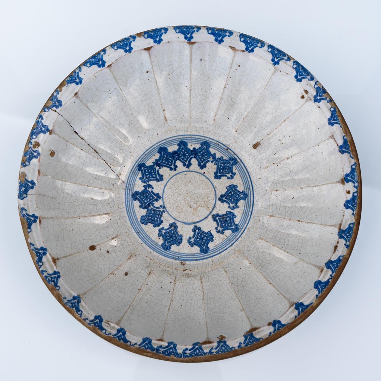 Piatto baccellato con decoro a spugnetta blu nel cavetto e sulla tesa.
