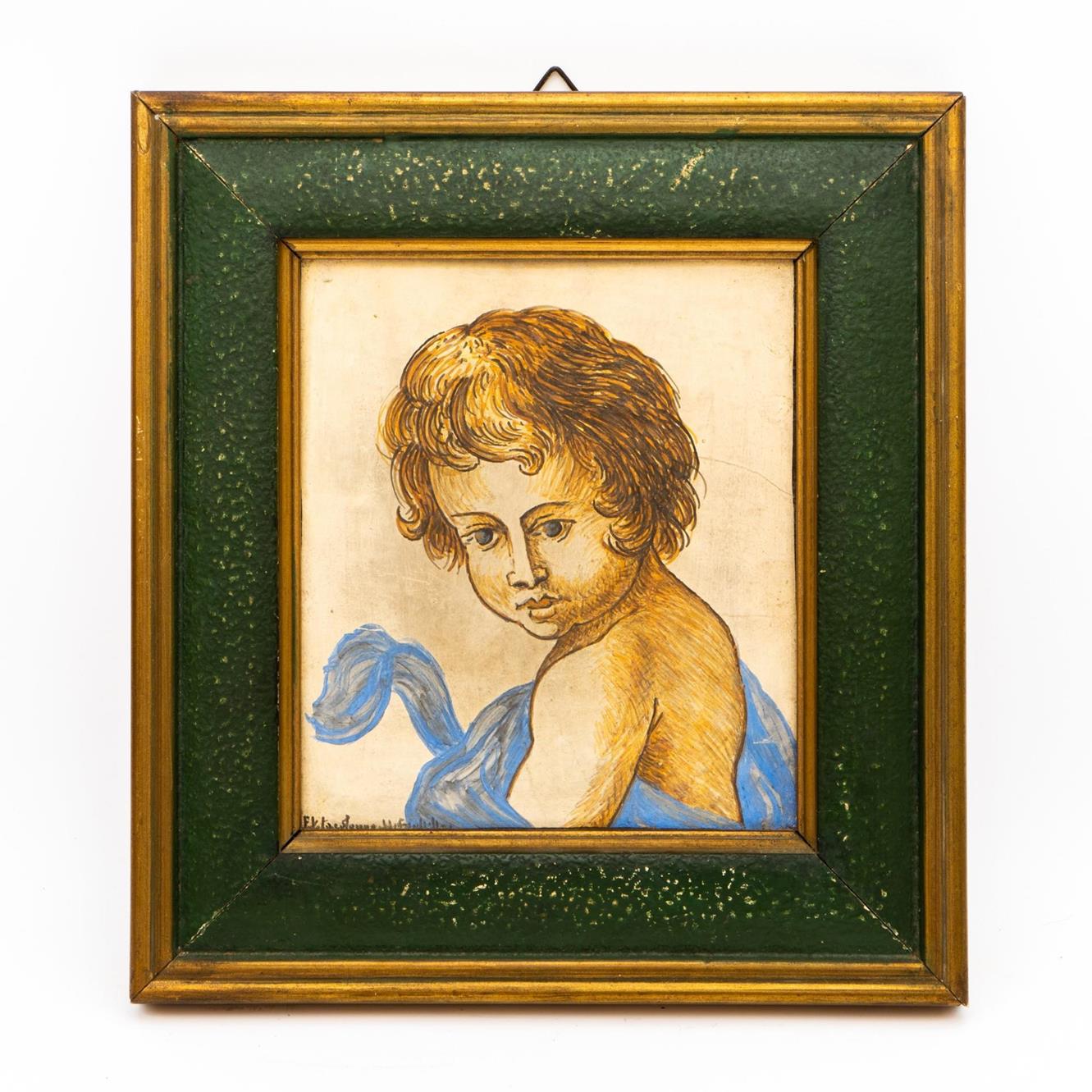 Mattonella ancora nello stato di biscotto raffigurante bambino con manto azzurro.