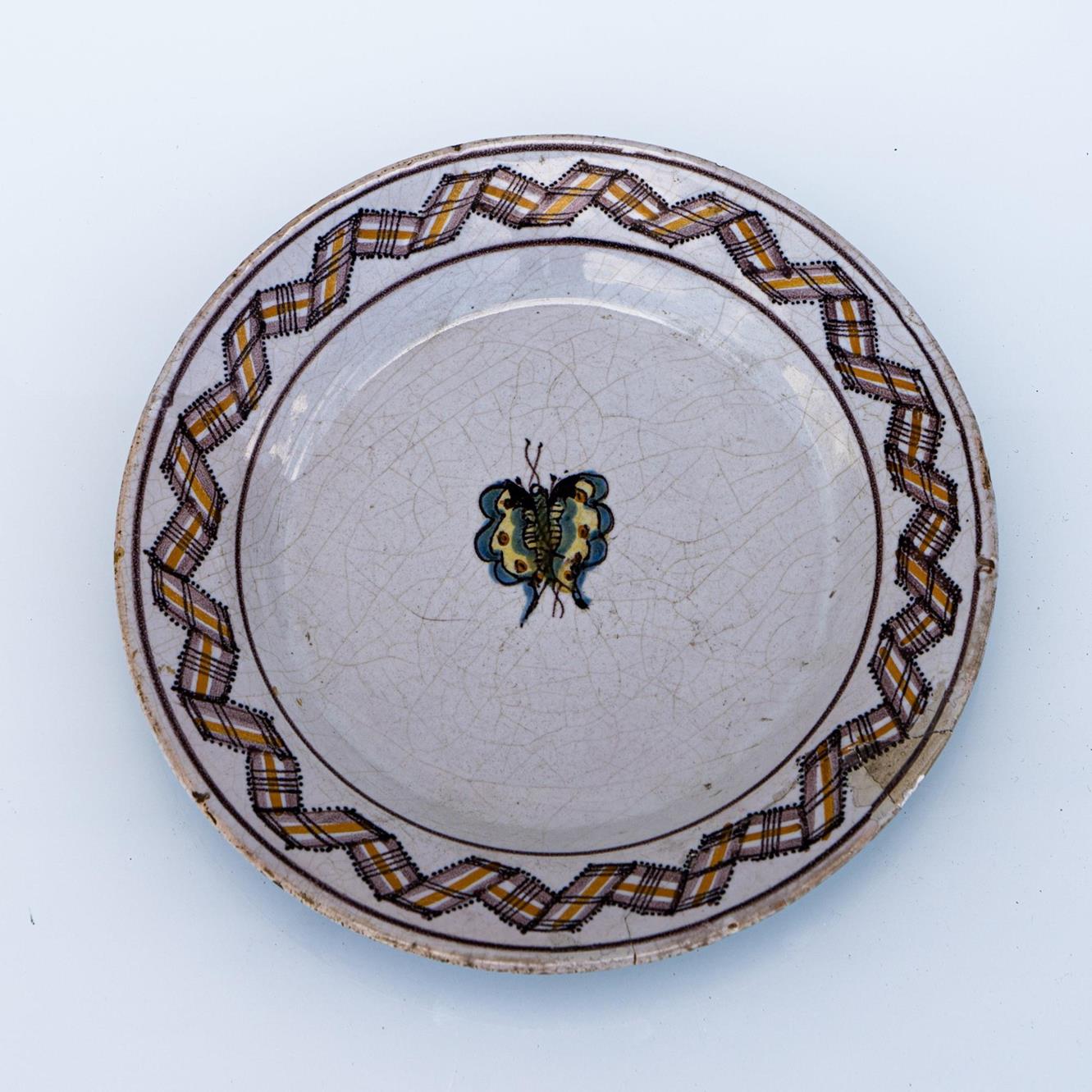 Piatto con decoro a nastro sulla tesa e farfalla nel cavetto.