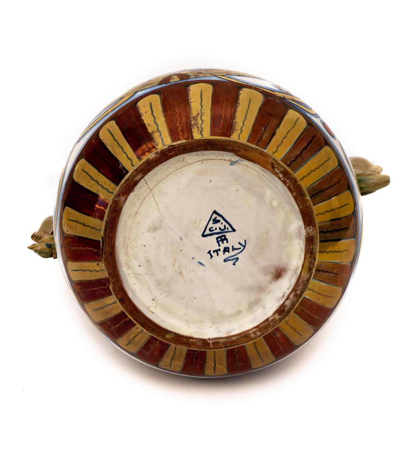 Vaso biansato realizzato da Paolo Rubboli a lustro con manici ad animali fantastici e aquila imperiale in blasone Manifattura di Gualdo Tadino degli anni '40 del Novecento