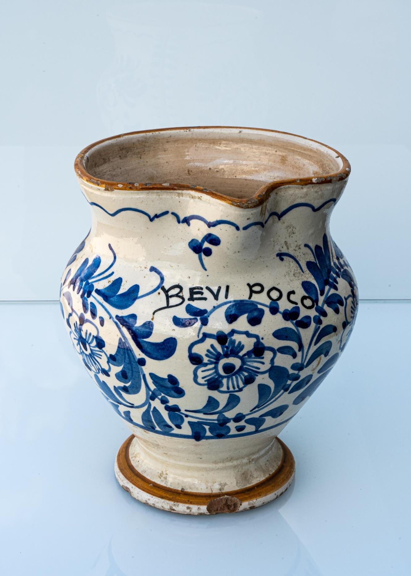Brocca con decoro a fiori e girali e scritta sul fronte "BEVI POCO". Manifattura umbra, 1918