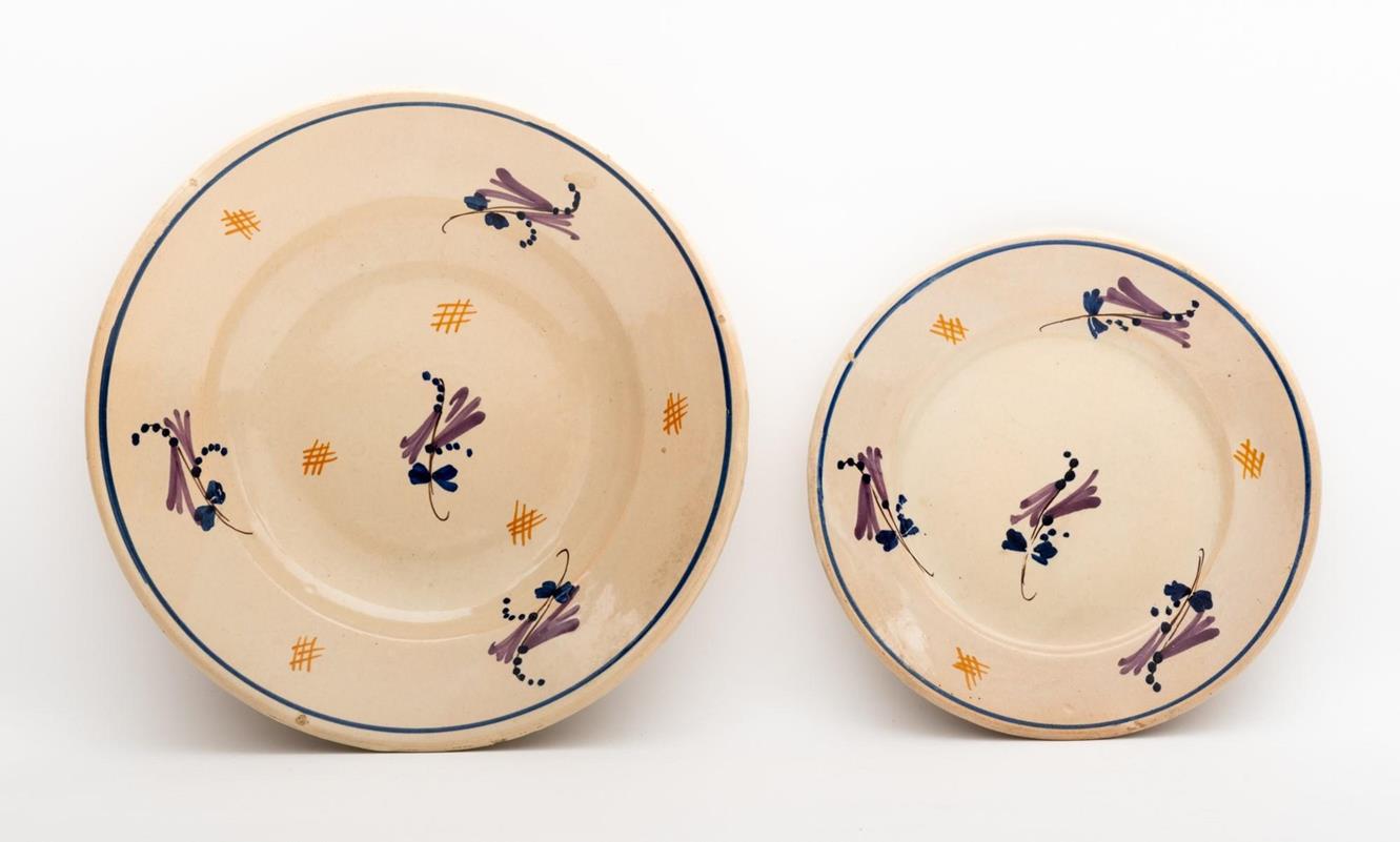 Coppia di piatti con decoro a fiori viola, uno fondo ed uno piano Manifattura di Castelli della prima metà del XX secolo
