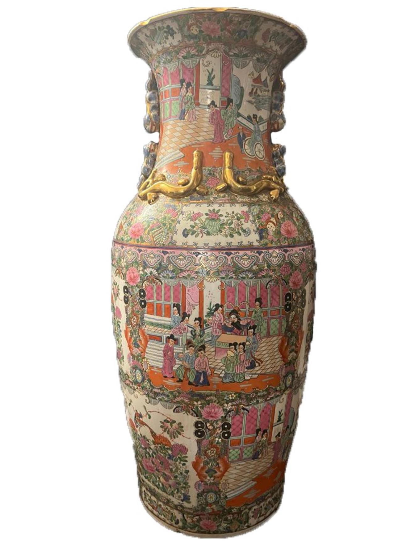 Grande vaso Canton in porcellana del XX secolo con decori di vita quotidiana in inserti fioriti.