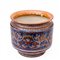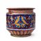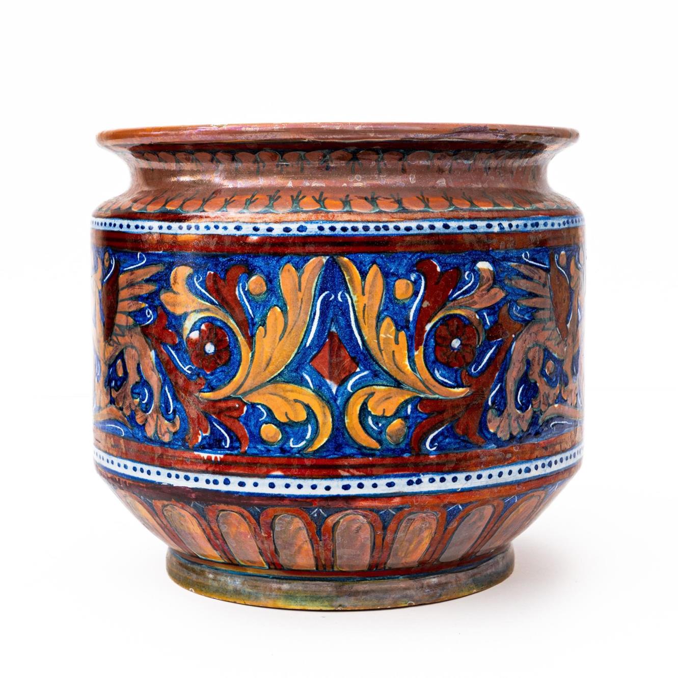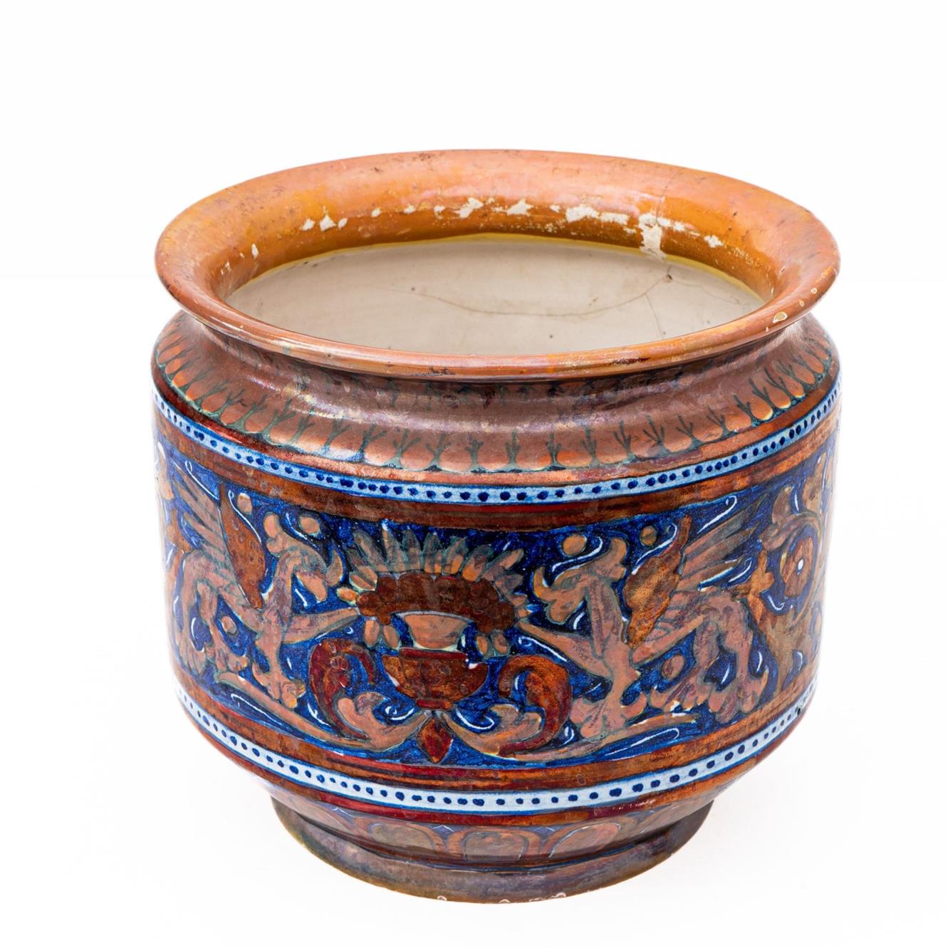 Cachepot in maiolica a lustro metallico rosso con draghi alati e trofeo.