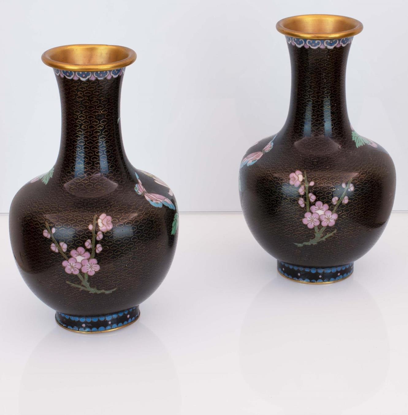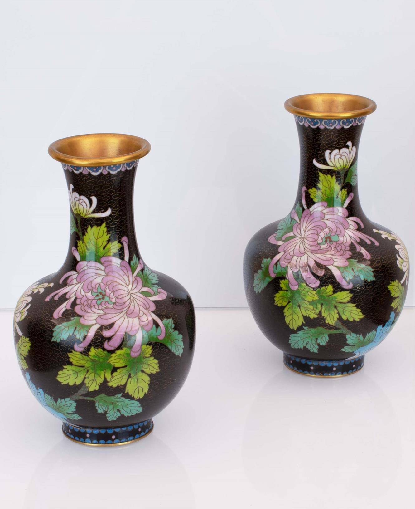 Lot 166 | Coppia di vasi cloisonnet neri con decori floreali. Basi in legno ebanizzato.