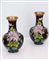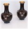 Coppia di vasi cloisonnet neri con decori floreali. Basi in legno ebanizzato. XX secolo