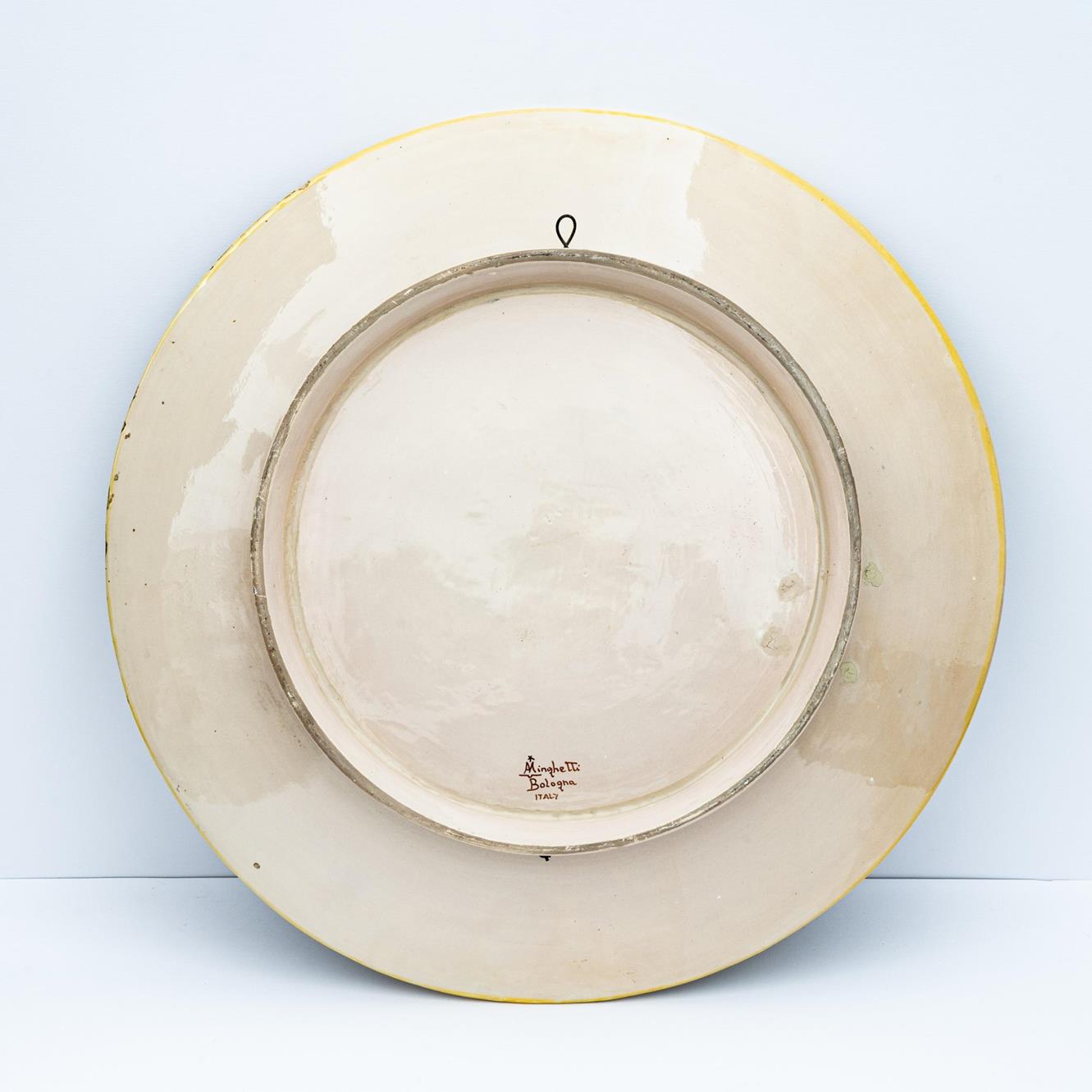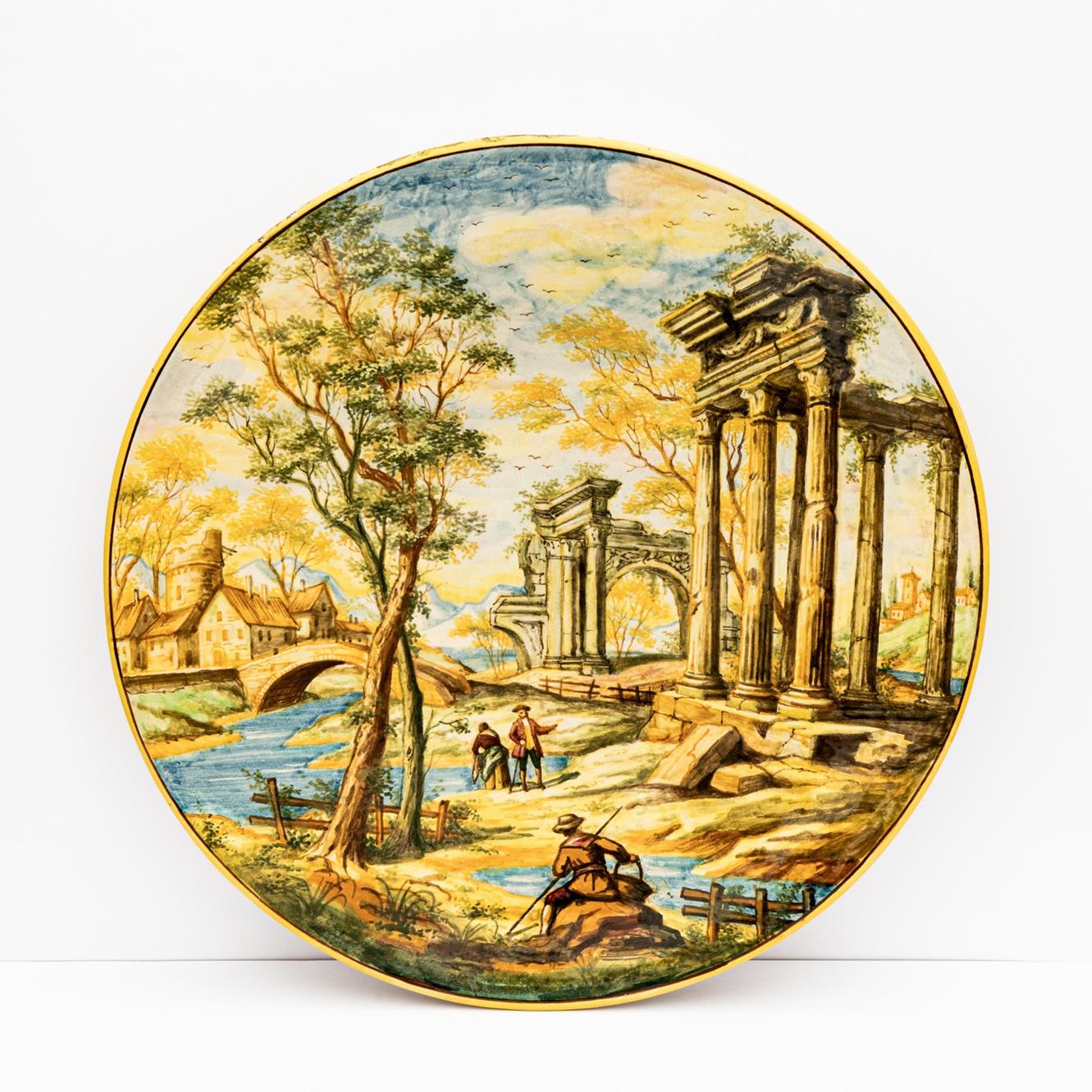 Grande piatto con paesaggio, viandanti e rovine Manifattura Minghetti, Bologna fine del XIX secolo