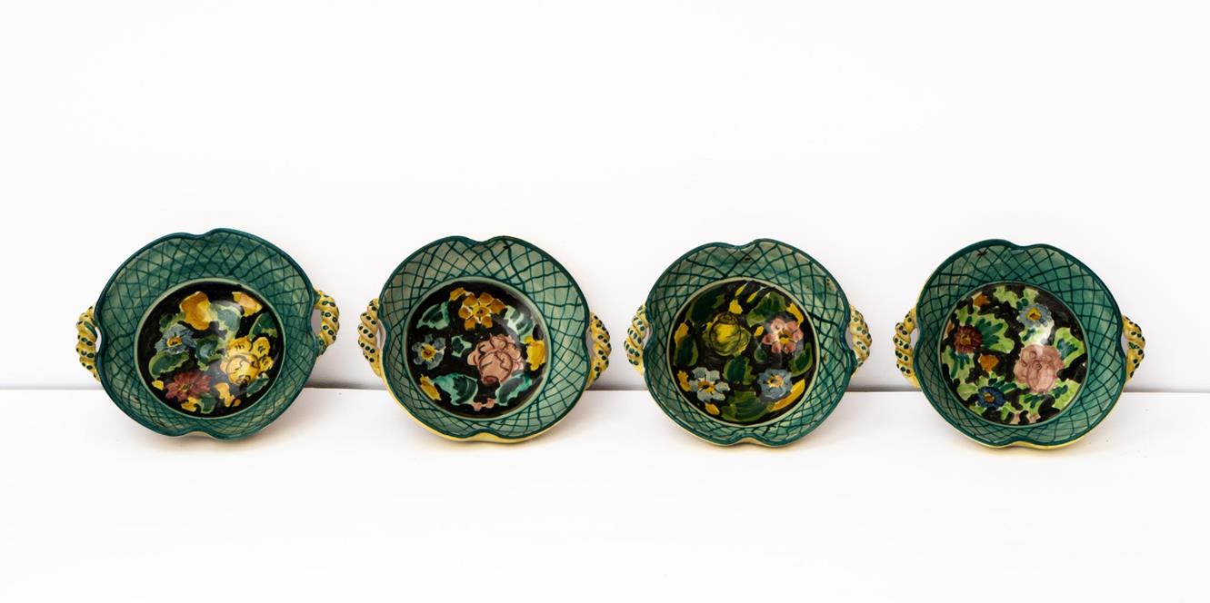 Set di quattro coppette in maiolica con manici intrecciati e decoro nel cavo con graticcio verde e fiori su fondo nero