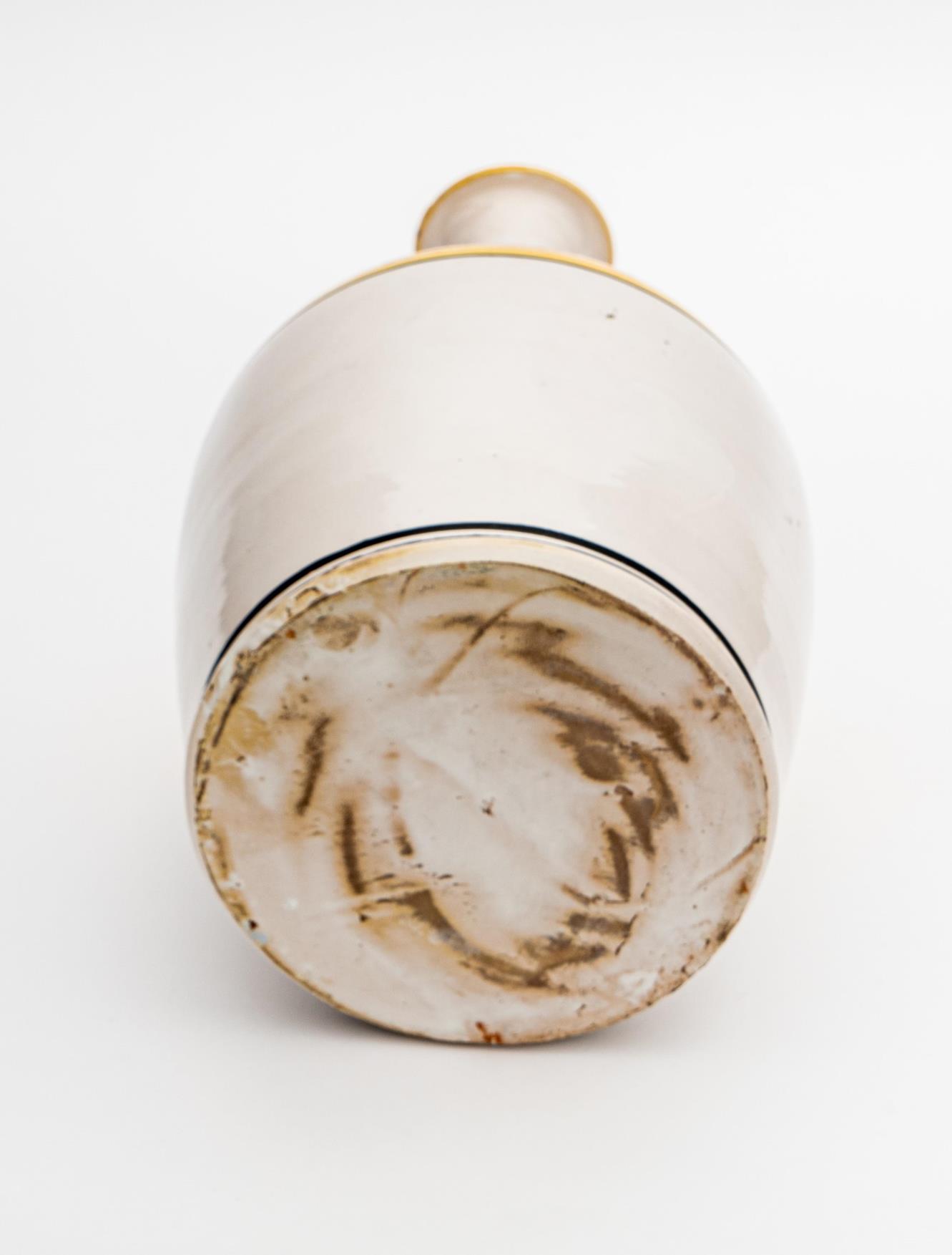 Bottiglia con decoro a girali fitomorfi arancio su fascia gialla