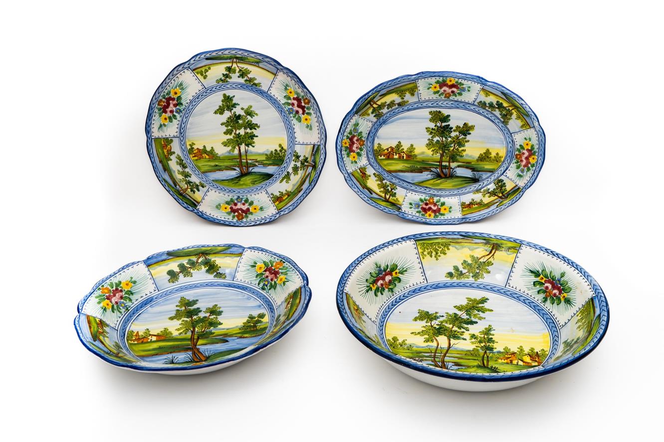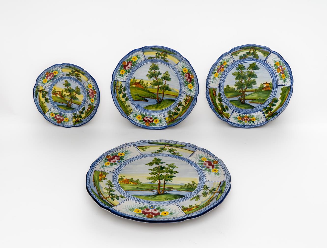 Servizio da pranzo da 12 con bordi mistilinei e decoro "a tombolino" della Fabbrica Bontempo Manifattura di Francavilla al Mare del XX secolo