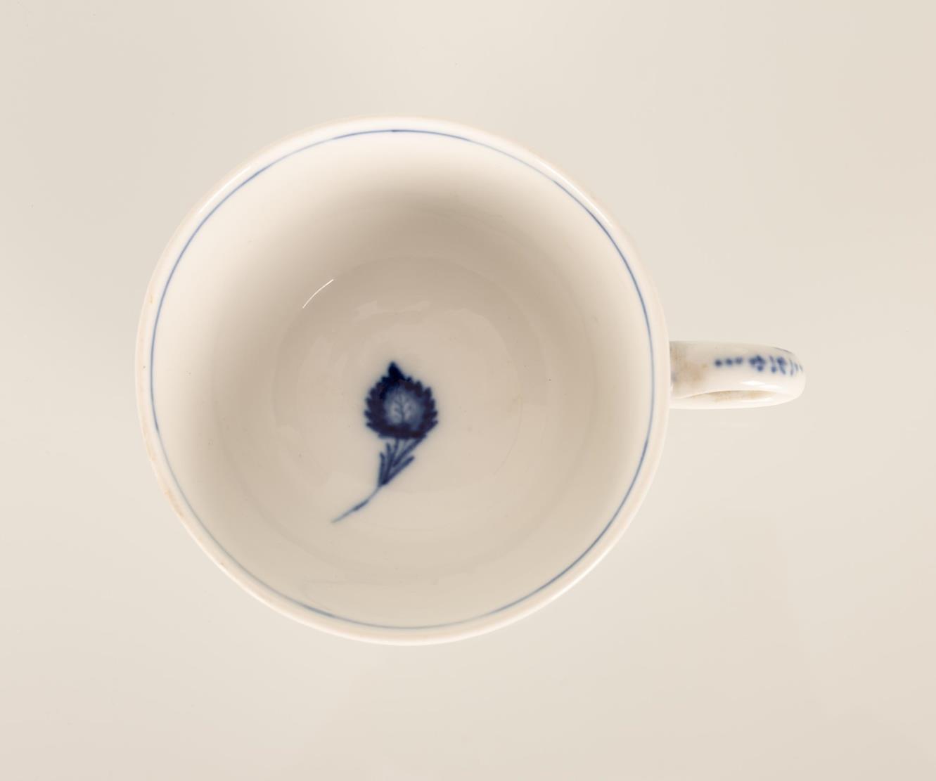 I piattini sono dipinti nel cavetto con egual decoro, mentre un singolo fiore blu con stelo è nella parte interna delle due tazzine.