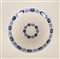 Decoro alterato floreale e fogliato su fondo blu, sia sul bordo delle tazzine che nella tesa dei piatti.