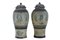 Coppia di potiche con coperchio in maiolica bianca e blu con decorazioni di gusto mitologico