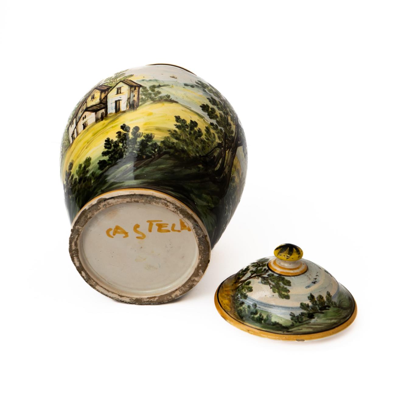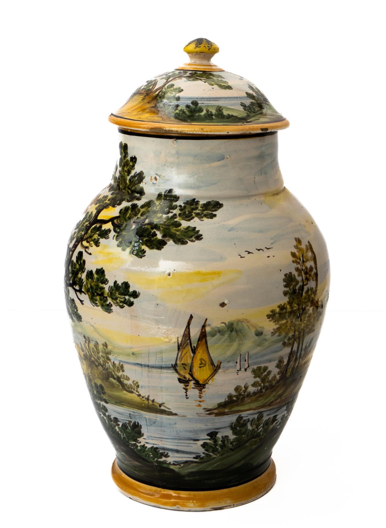 Vaso potiche in maiolica con decoro nel corpo e nel coperchio con ornato a paese Manifattura di Castelli del XX secolo