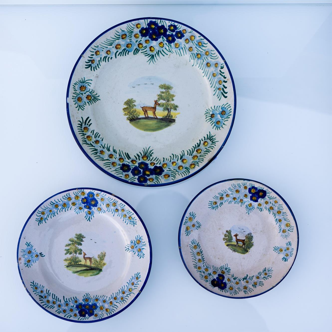 Lot 252 | Lotto di tre piattini Bozzelli Rapino con cervo nel cavetto e fiori nella tesa