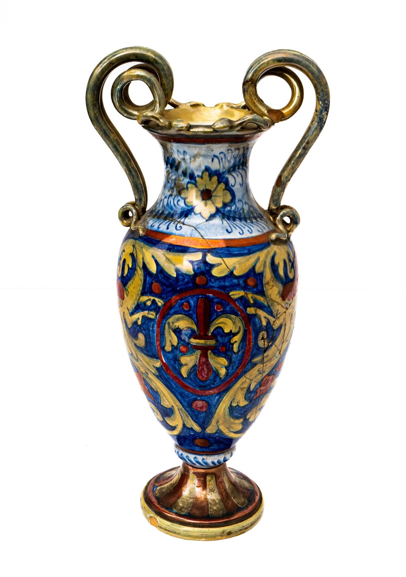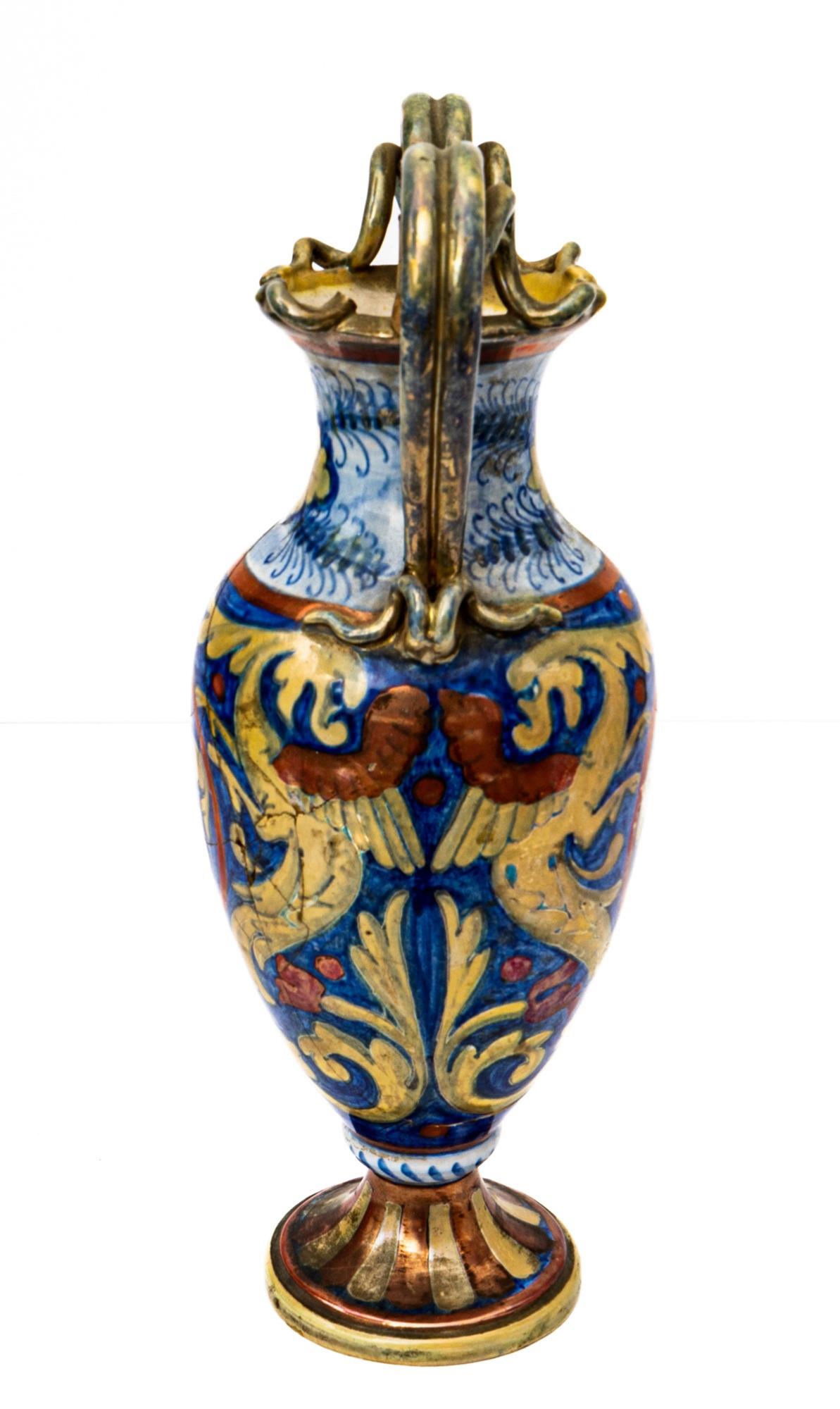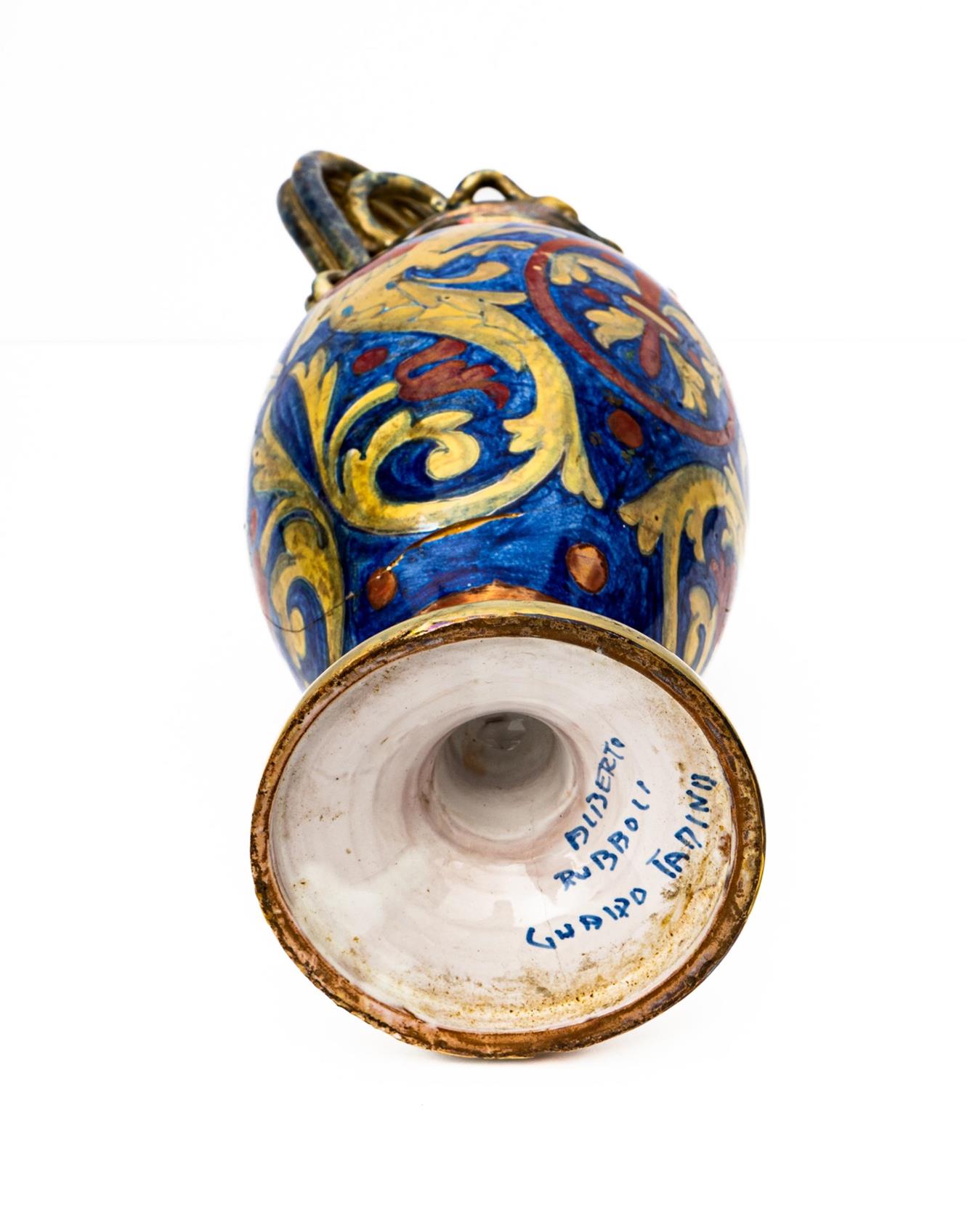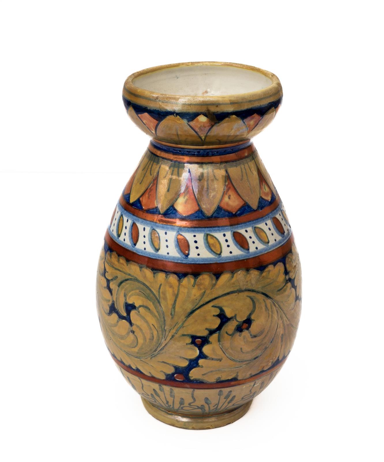 Coppia di vasi a lustro metallico di cui uno biansato ad anfora di Alberto Rubboli e l'altro piriforme con decori fogliati Manifattura di Gualdo Tadino del XX secolo