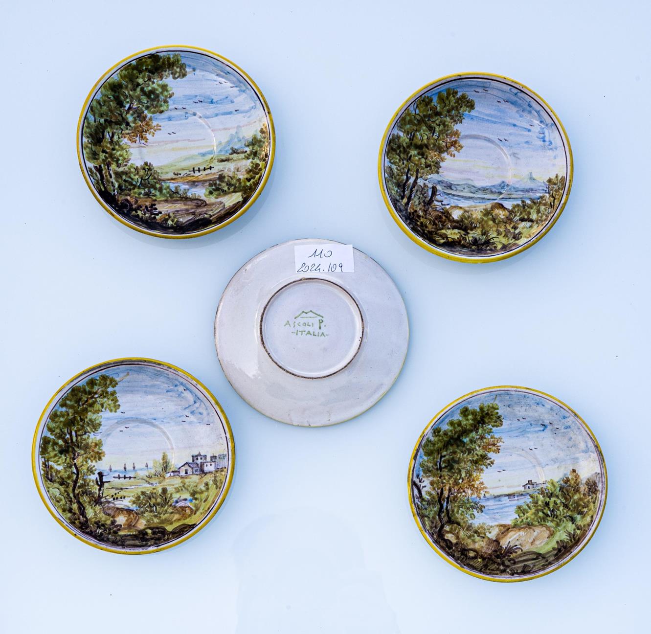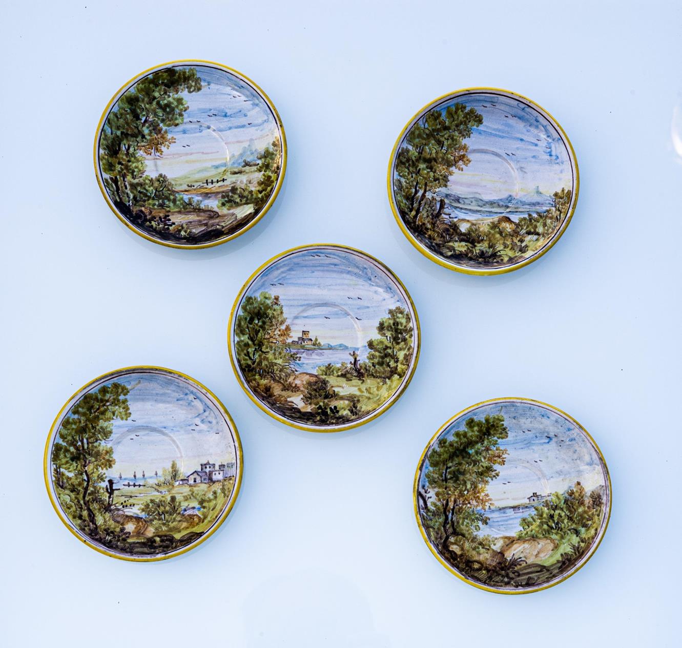 Cinque piattini con paesaggo agreste. Fabbrica Matricardi, Ascoli degli anni Venti del XX secolo