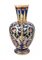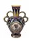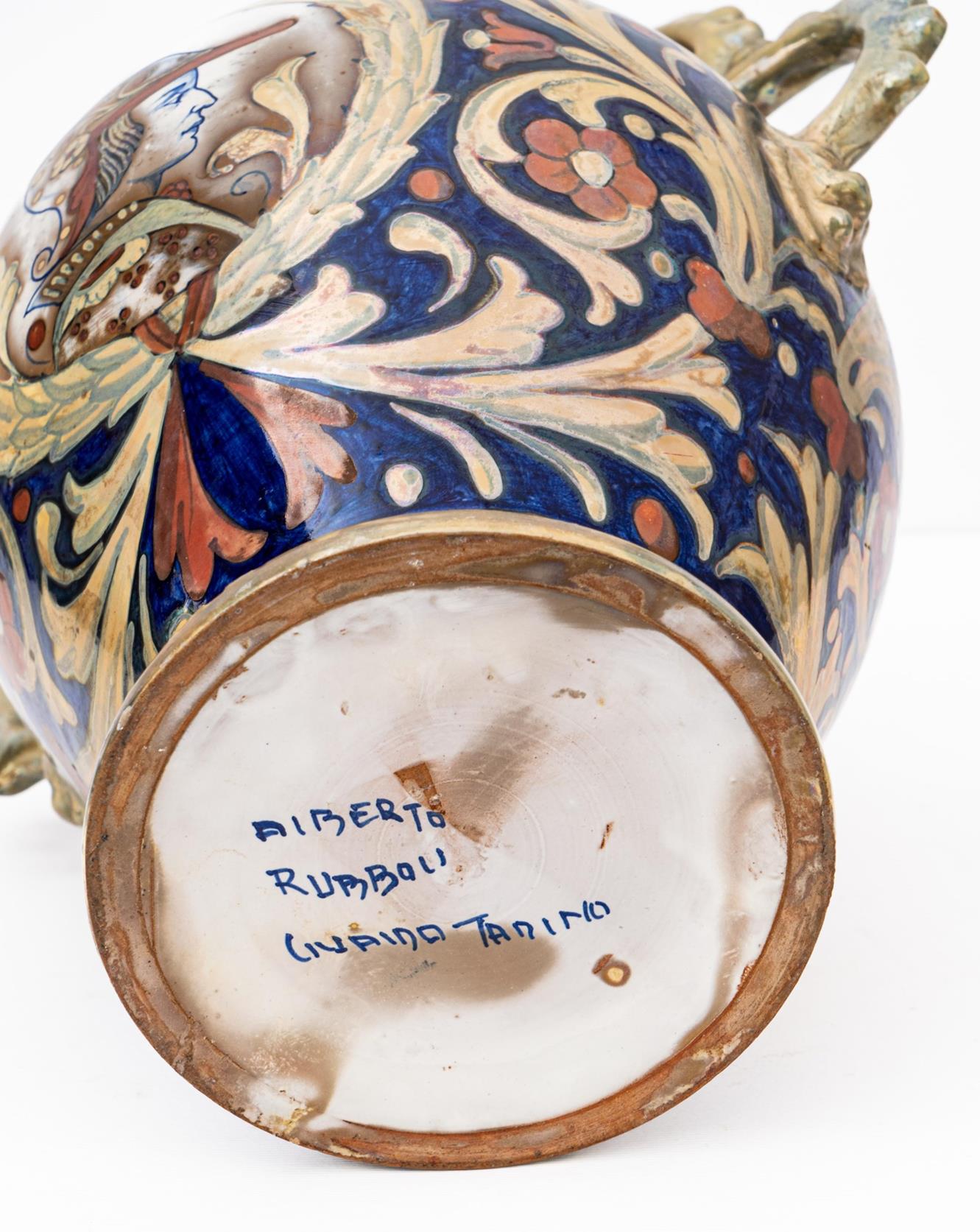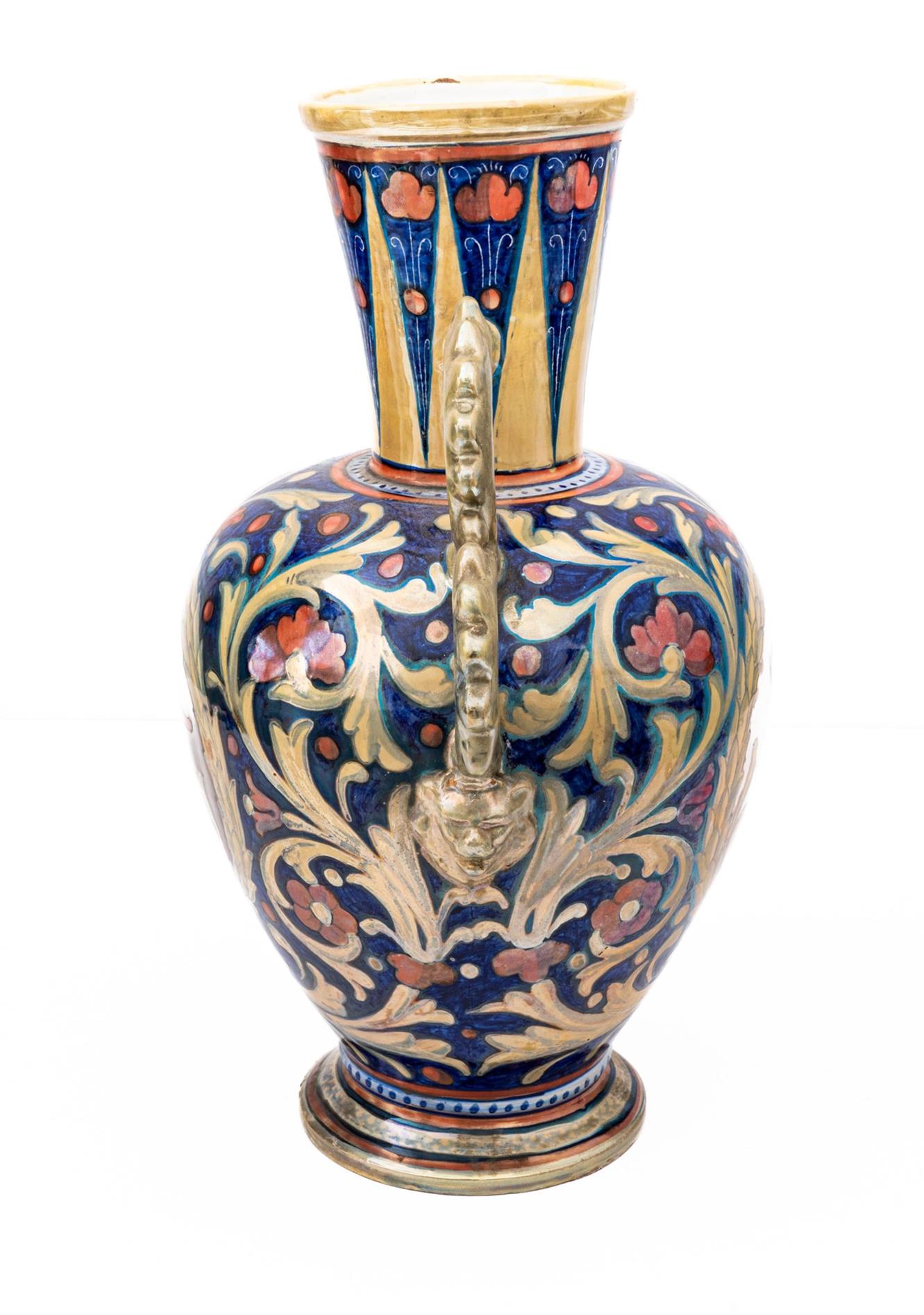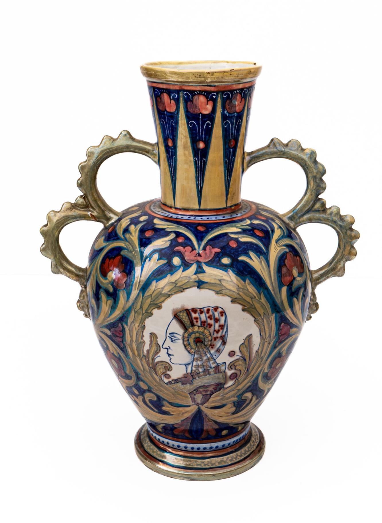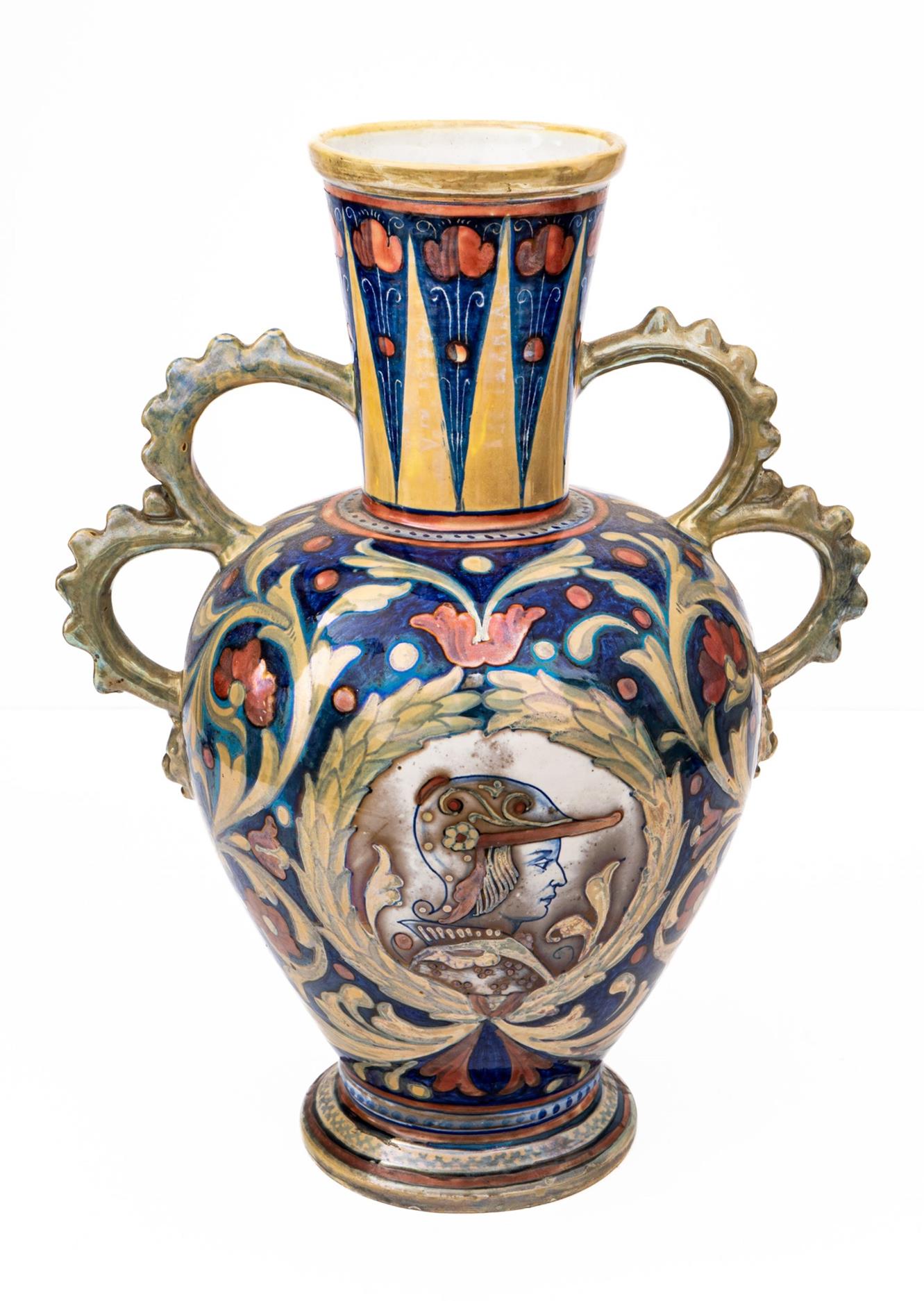 Vaso a lustro metallico realizzato da Alberto Rubboli con doppie anse con motivi a rilievi di stile eclettico ed elementi rinascimentali e moreschi in entrambi i lati. Centrato da medaglioni con proflo di guerriero e dama