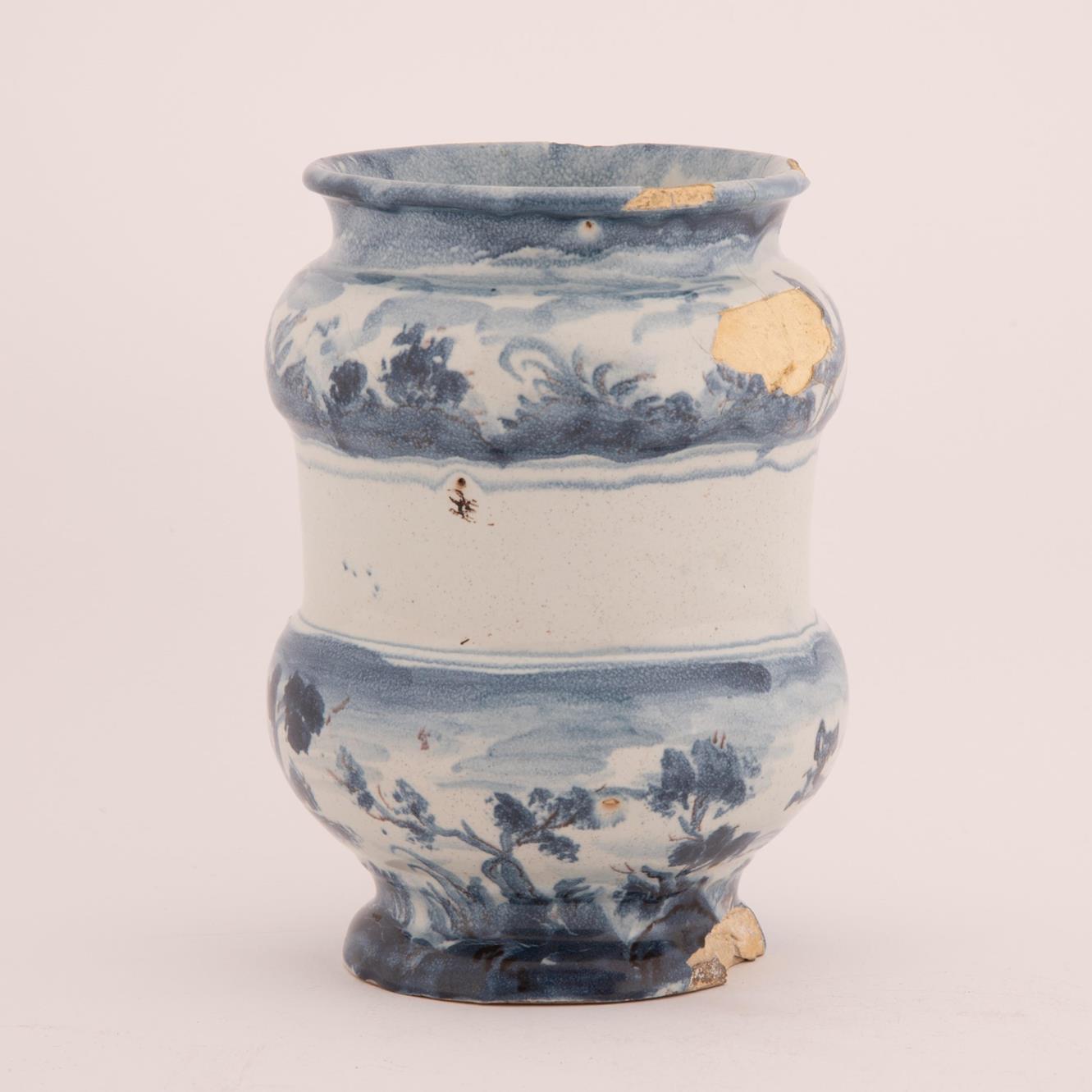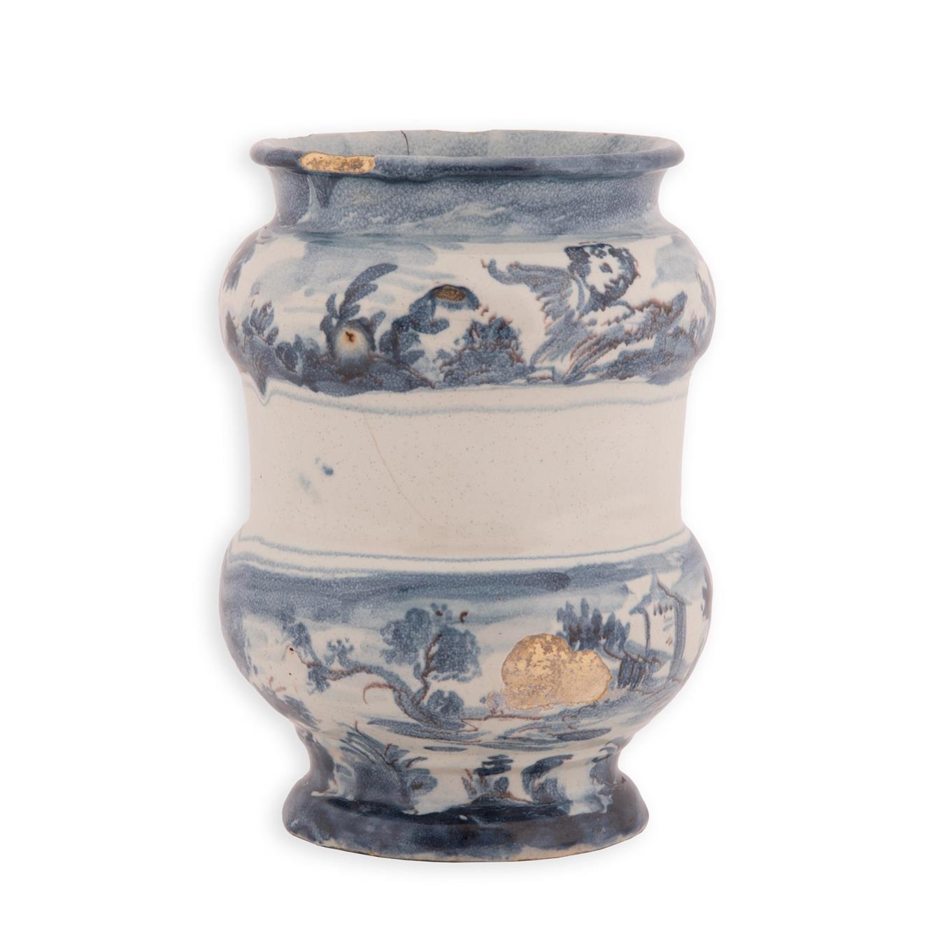 Albarello in maiolica a fondo bianco decorato nei toni del blu con putti e paesaggi Manifattura di Savona del XVIII secolo