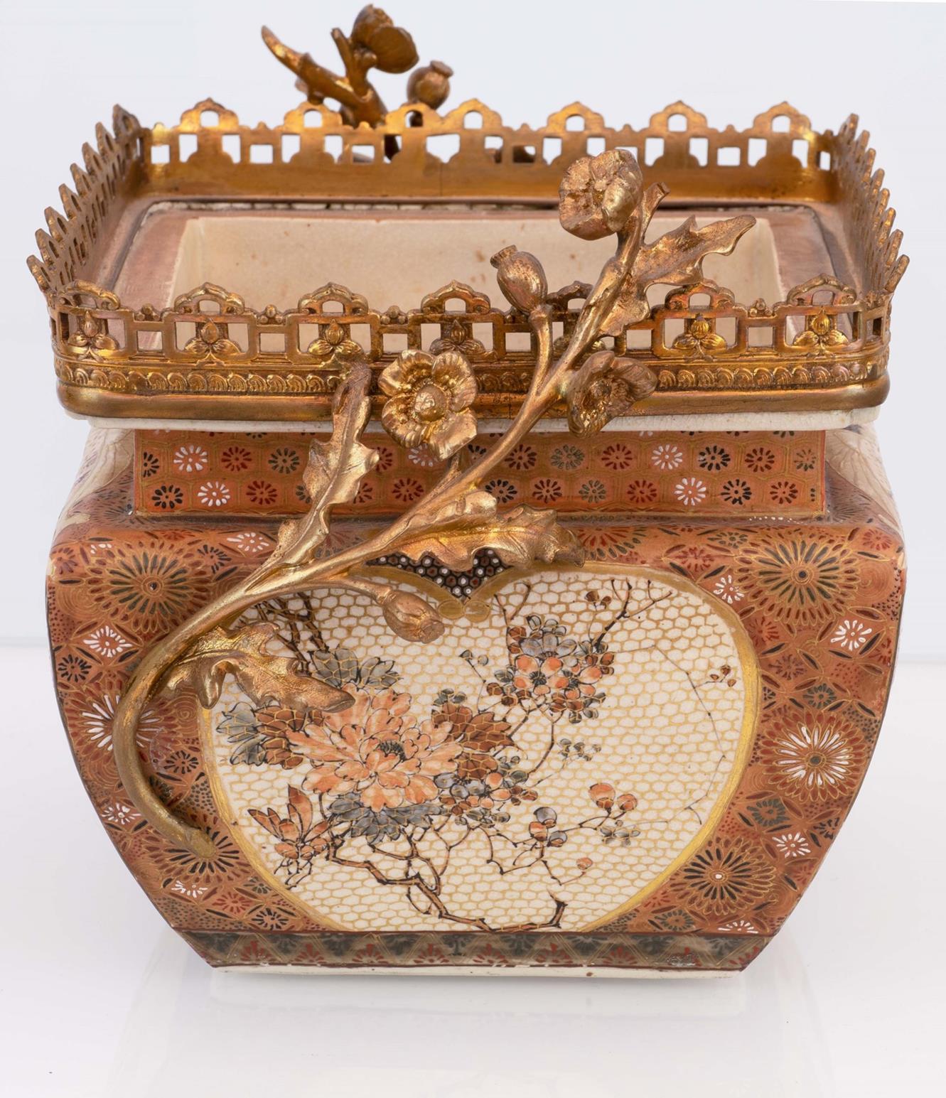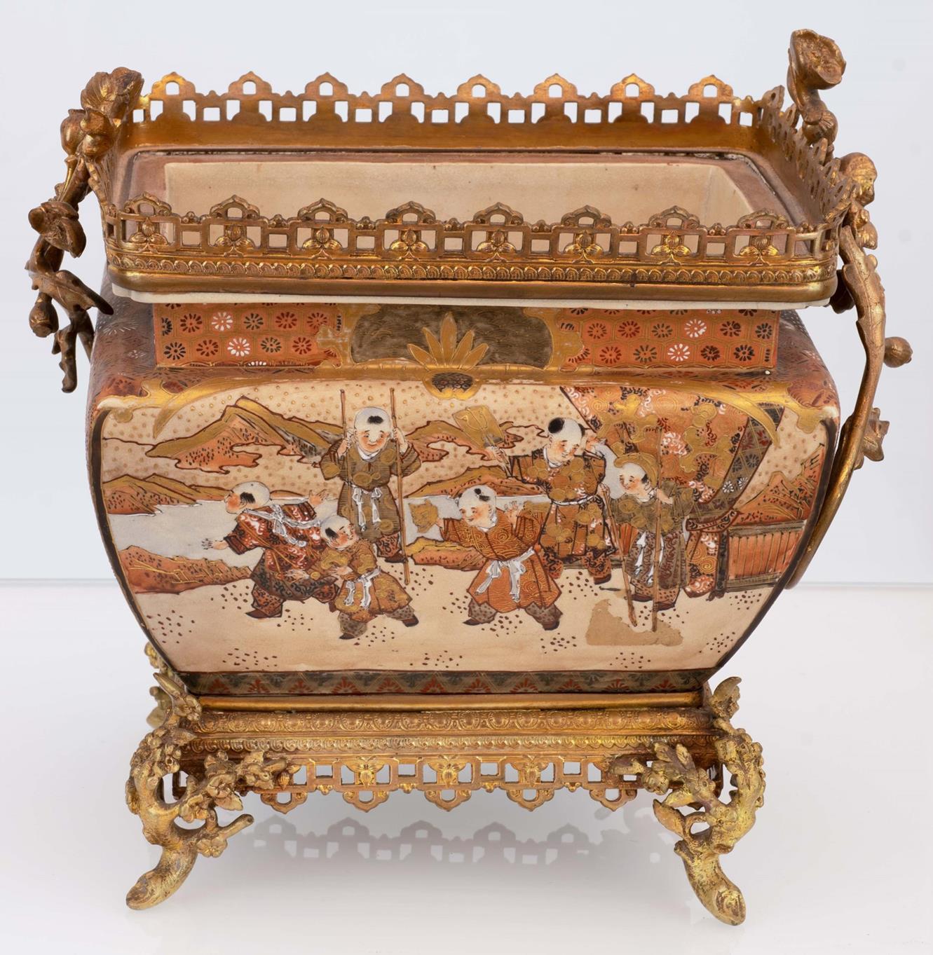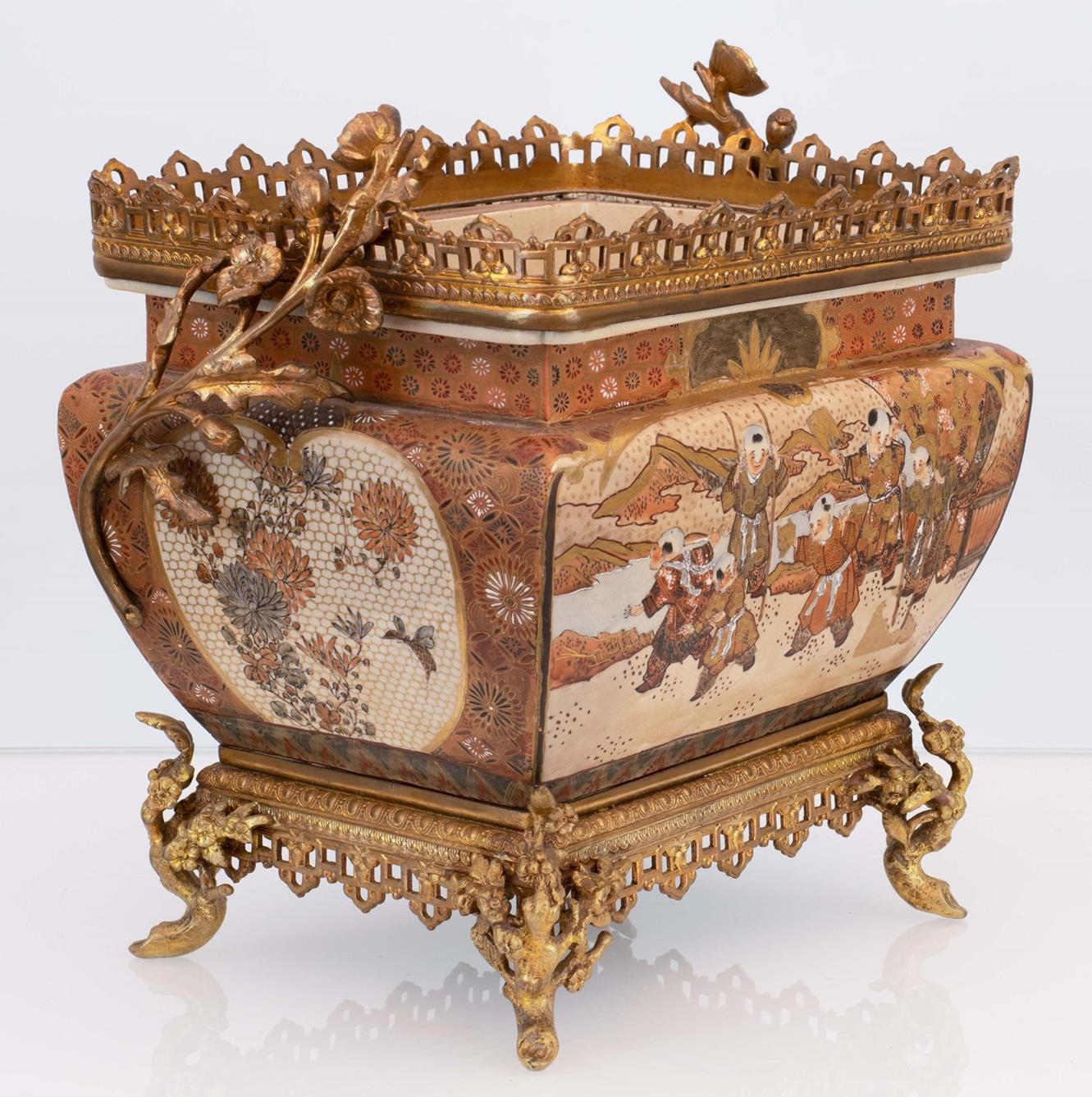 Cachepot porta bonsai Satsuma con corpo decorato in ricca policromia e oro. Base e balaustra in bronzo dorato con anse a racemi fiorati. Piedini fitomorfi.