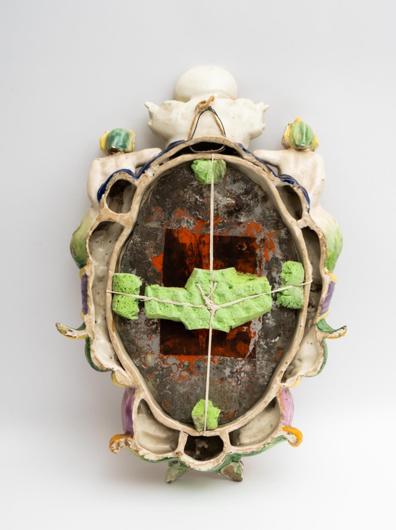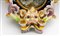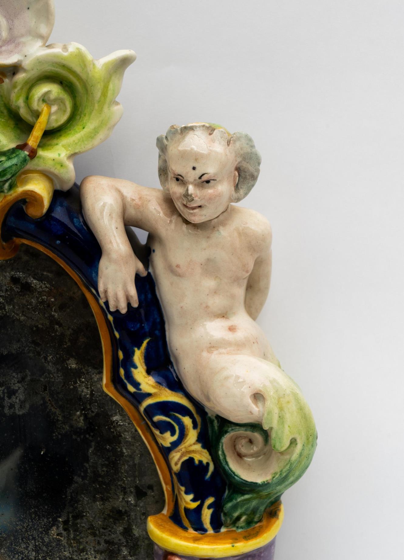 Deliziosa applique candeliere a due fuochi in maiolica policroma con mascherone, figure grottesche ai lati e specchio al mercurio.