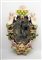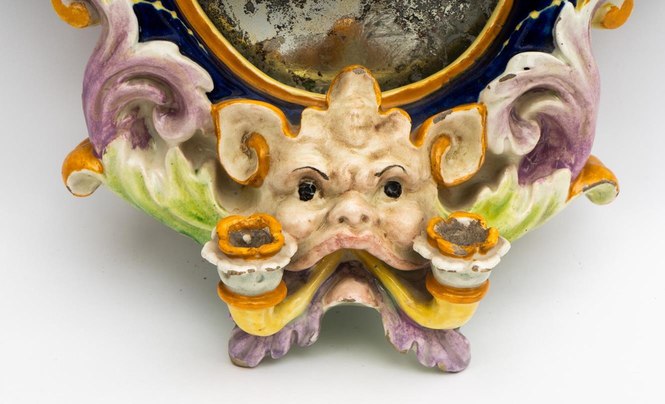 Deliziosa applique candeliere a due fuochi in maiolica policroma con mascherone, figure grottesche ai lati e specchio al mercurio. Manifattura Battaglia, Napoli XIX secolo