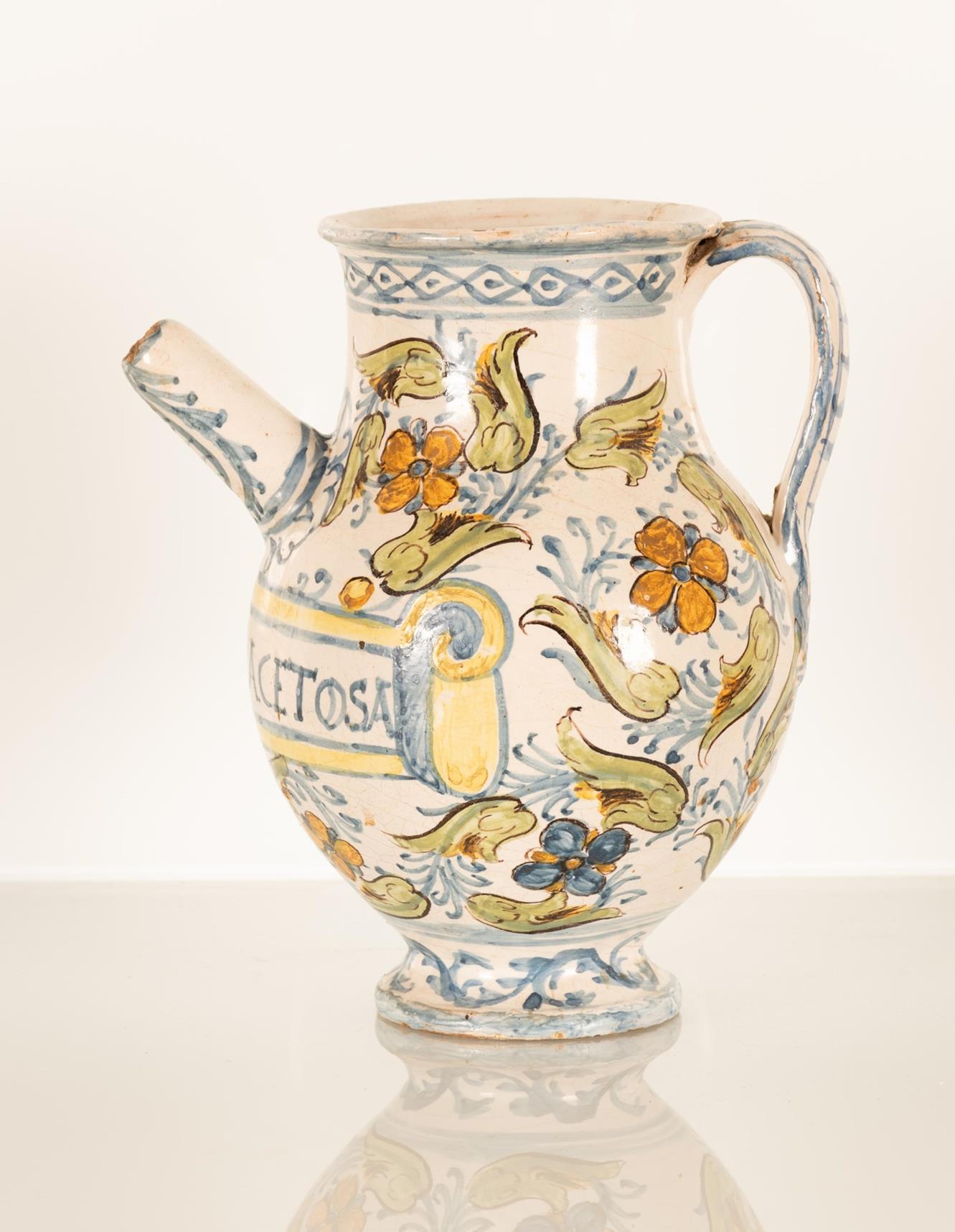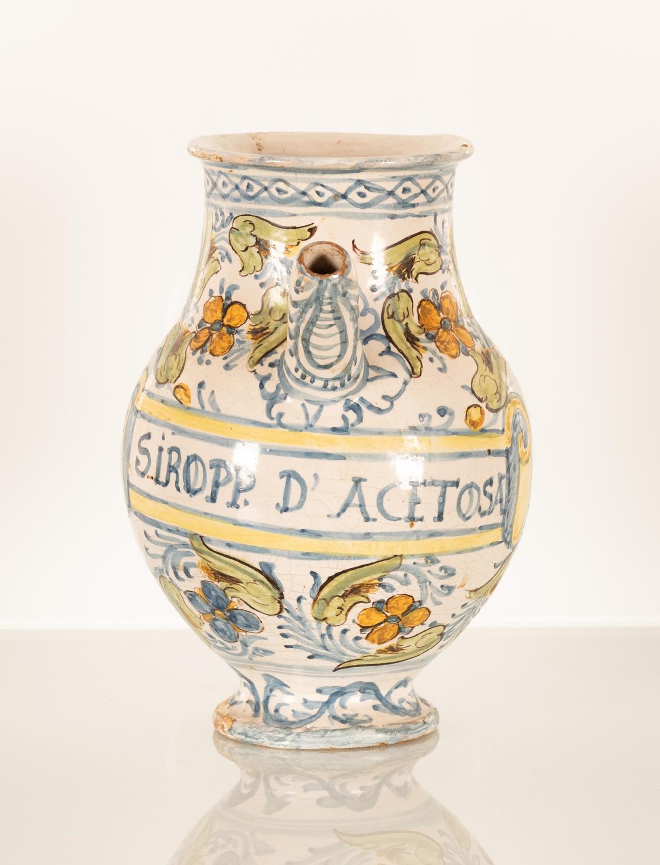 Orcio da farmacia decorato con girali fioriti e con cartiglio indicante denominazione del farmaco contenuto in lettere capitali "SIROPP. D'ACETOSA". Manifattura laziale della fine del XVII secolo e gli inizi del XVIII secolo.