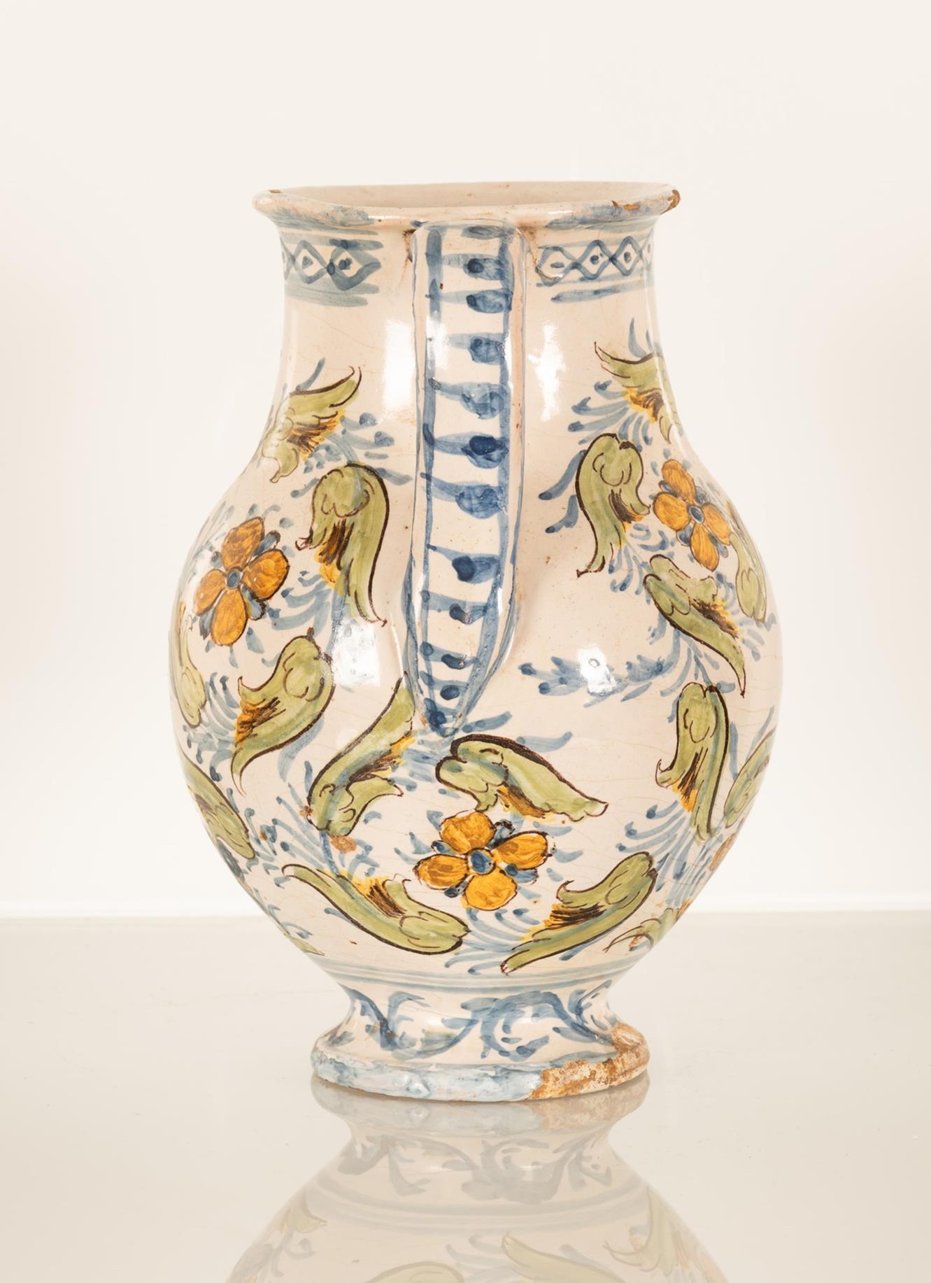 Orcio da farmacia decorato con girali fioriti e con cartiglio indicante denominazione del farmaco contenuto iManifattura laziale della fine del XVII secolo e gli inizi del XVIII secolo.