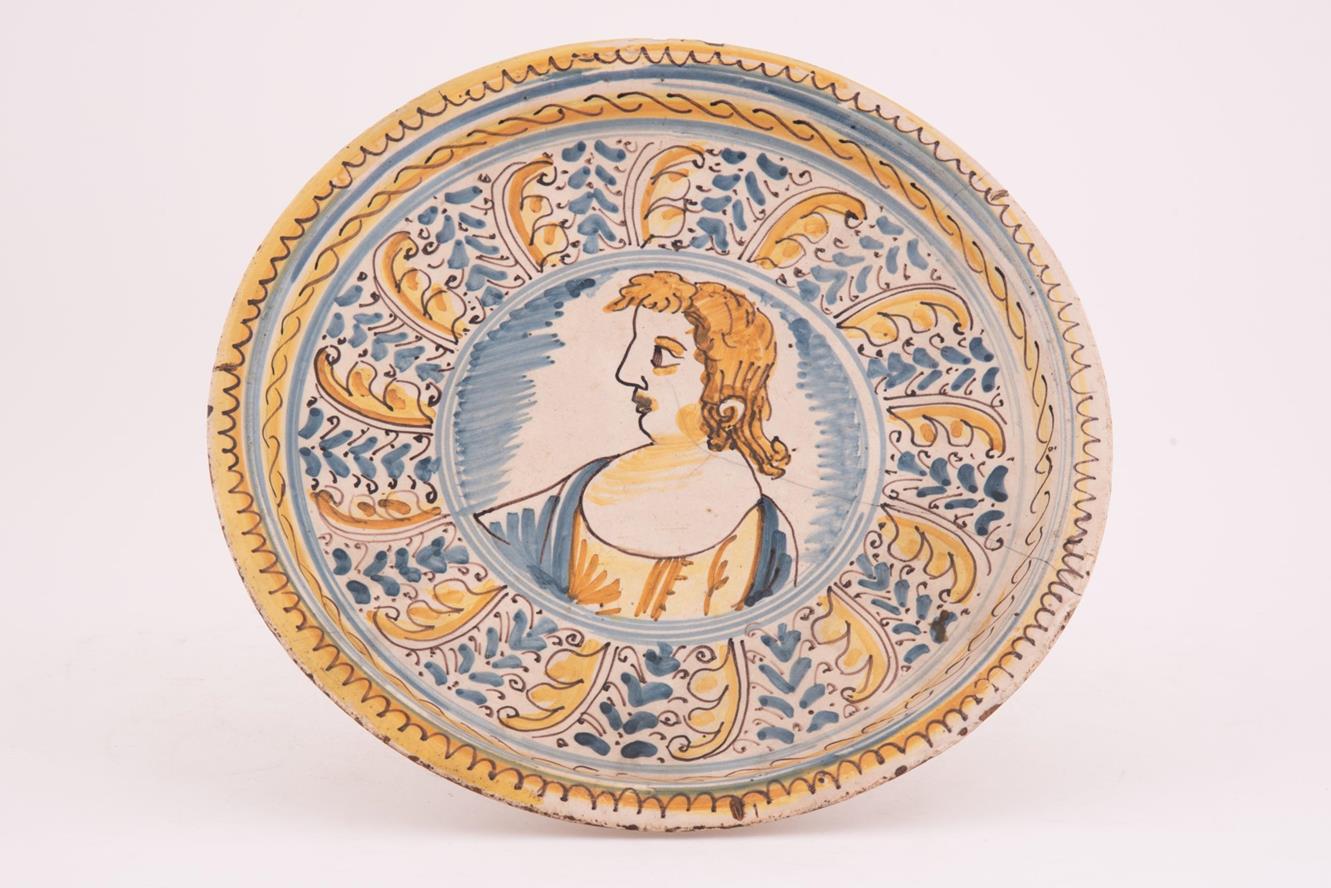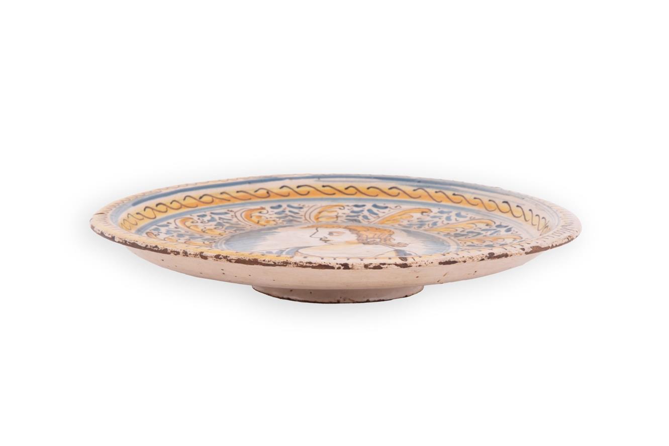 Alzata in maiolica decorata in policromia nello stile compendiario con al centro raffigurato un busto femminile. Manifattura di Bussi sul Tirino del XVII secolo
