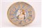 Alzata in maiolica decorata in policromia nello stile compendiario con al centro raffigurato un busto femminile.
