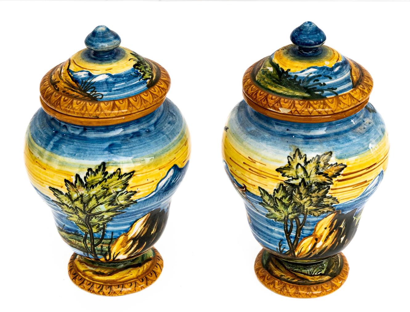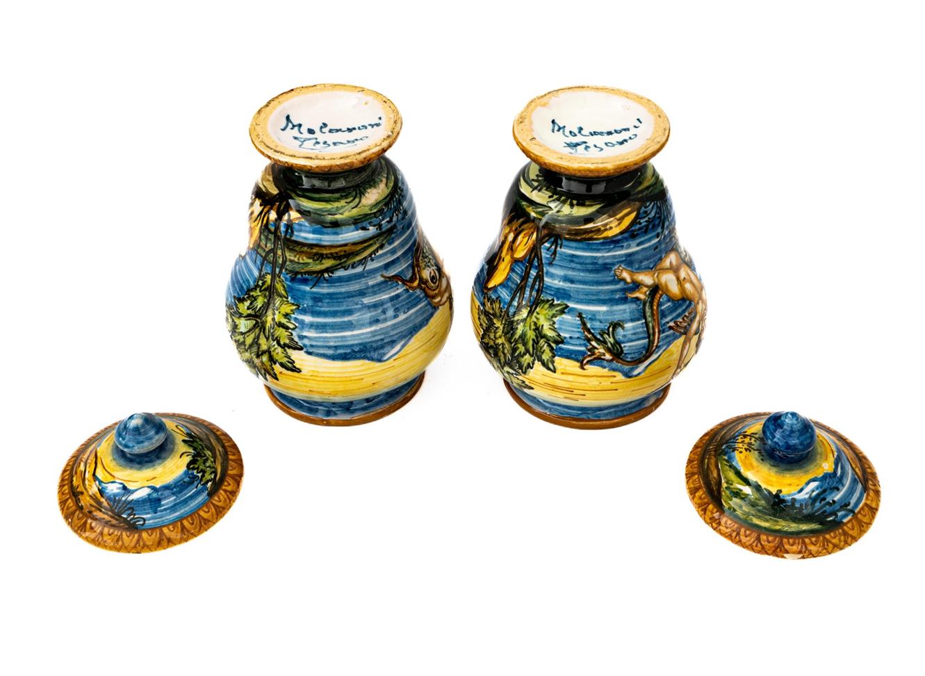 Coppia di piccole potiche con putti che cavalcano serpenti marini Manifattura Molaroni, Pesaro del XIX secolo